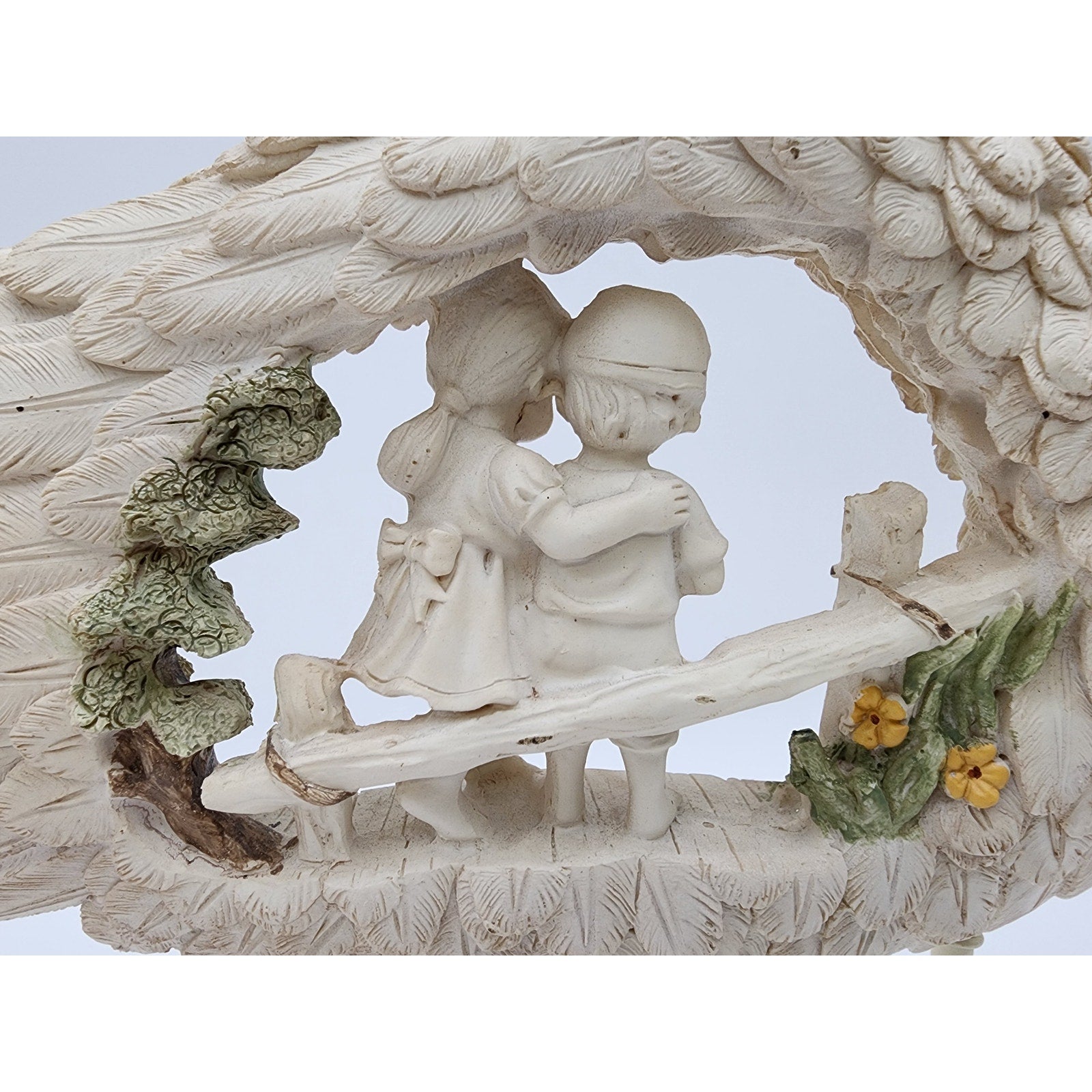 Two children stand affectionately together on a wooden plank bridge, embraced by a sweeping angel wing that rises from floral-adorned columns.