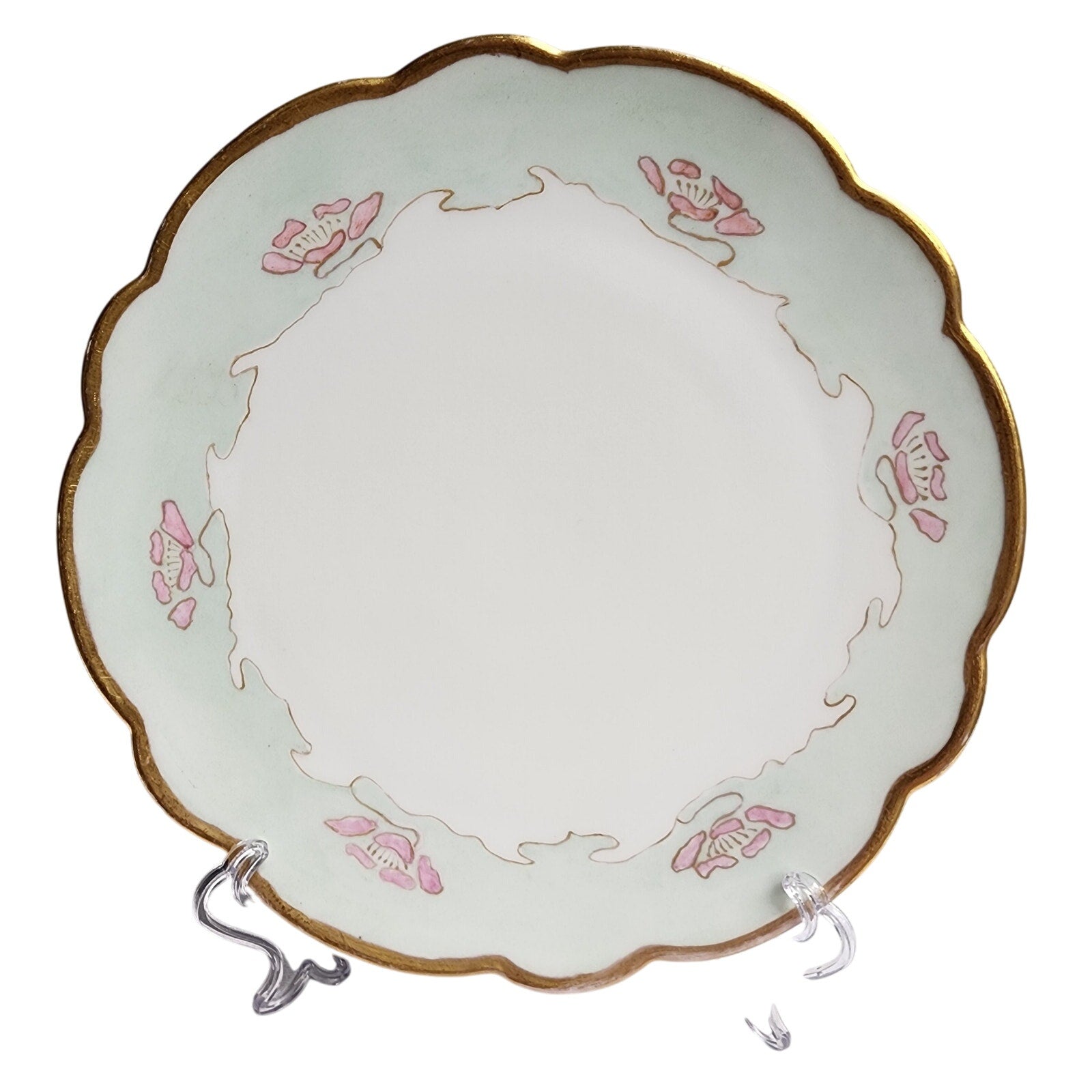 • Design: Scalloped edge with a .1875" wide gilt band, pale green border adorned with pink florals, and a thin inner gold band framing the white center.