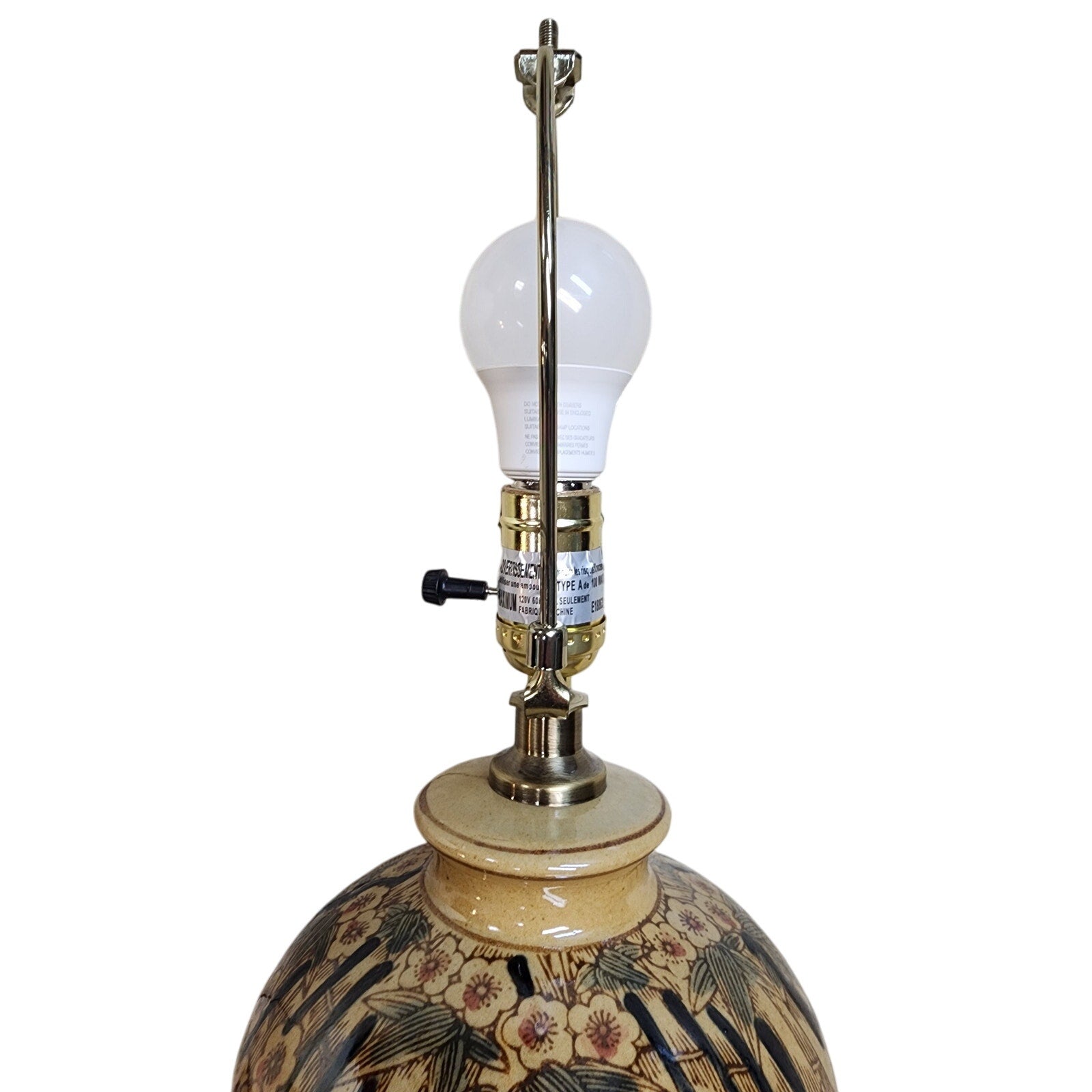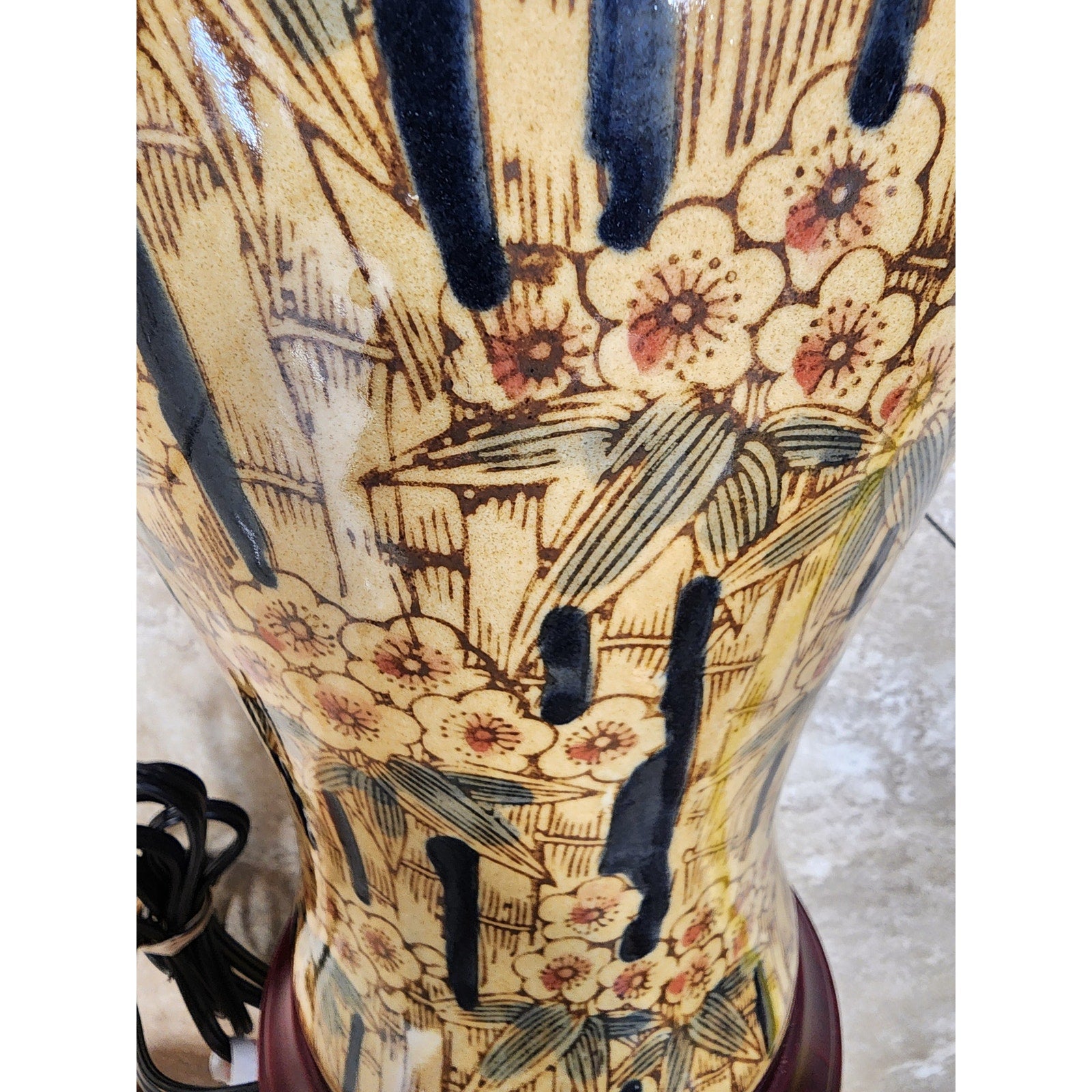 Asian Style Ceramic Table Lamp Bamboo Floral Motif 25”H w/ Shade & Wood Base