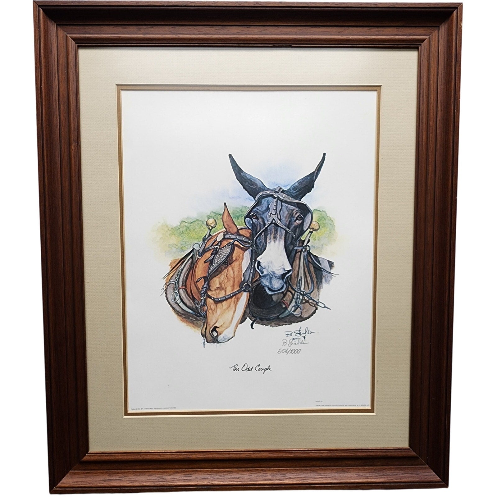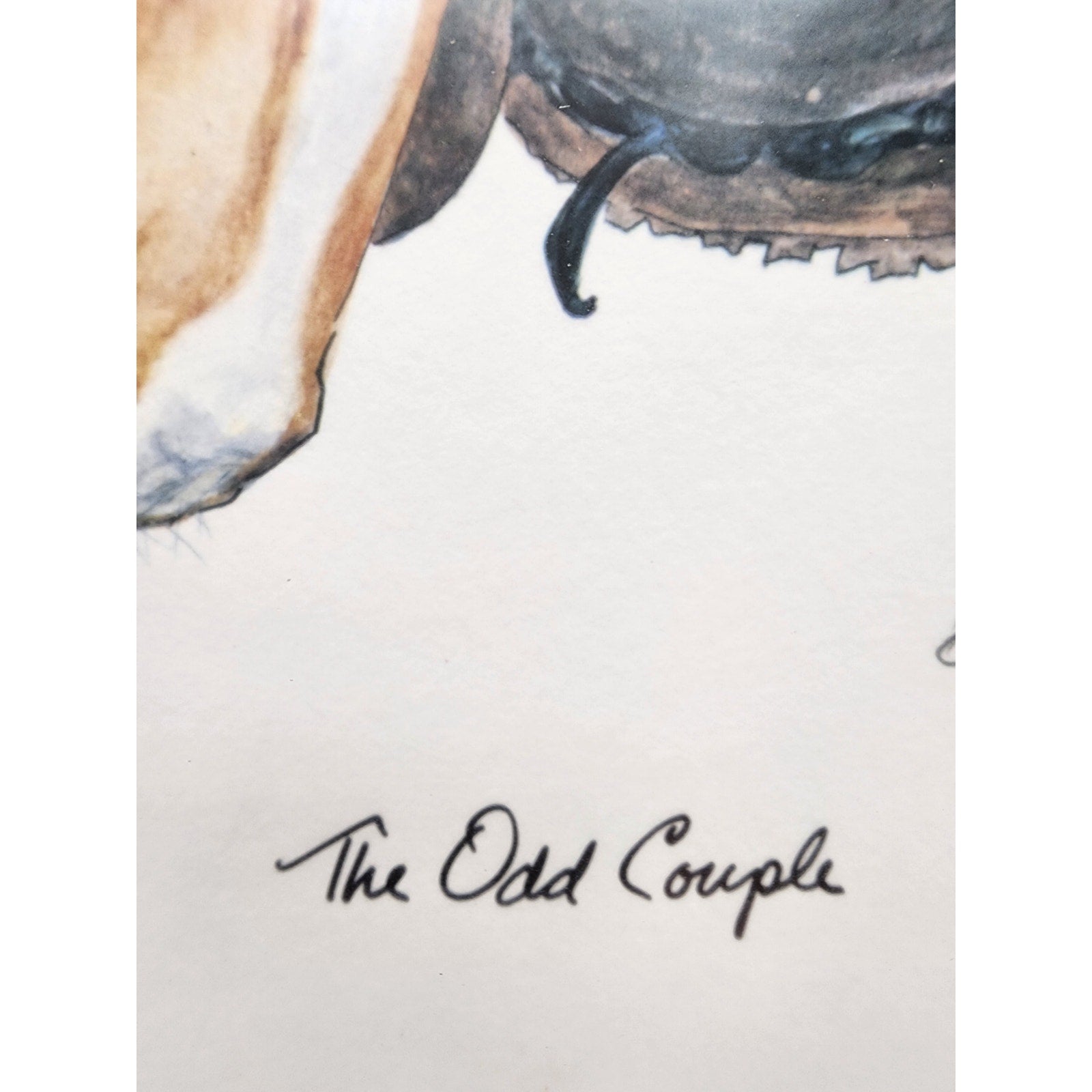 Limited edition “The Odd Couple” print by celebrated Western artist Bonnie Shields, known as the “Tennessee Mule Artist” for her humorous and detailed depictions of mules, horses, and rural life.