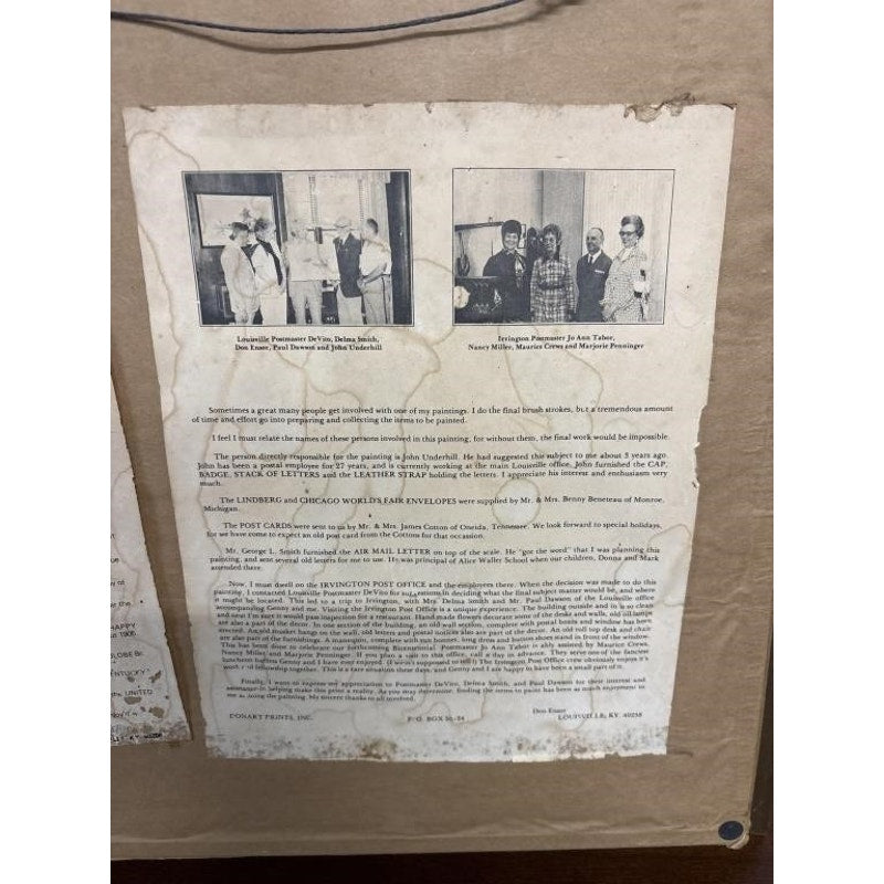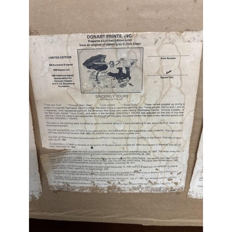 Beautiful vintage lithographic art print titled “Sincerely Yours” by C. Don Ensor from 1975. This limited-edition print, published by Donart Incorporated, features Ensor’s signature realist style, depicting a nostalgic still-life vignette celebrating the U.S. Post Office—think neatly stacked mail, a vintage letter opener, stamps and stationery—all arranged with meticulous detail which you'll love.