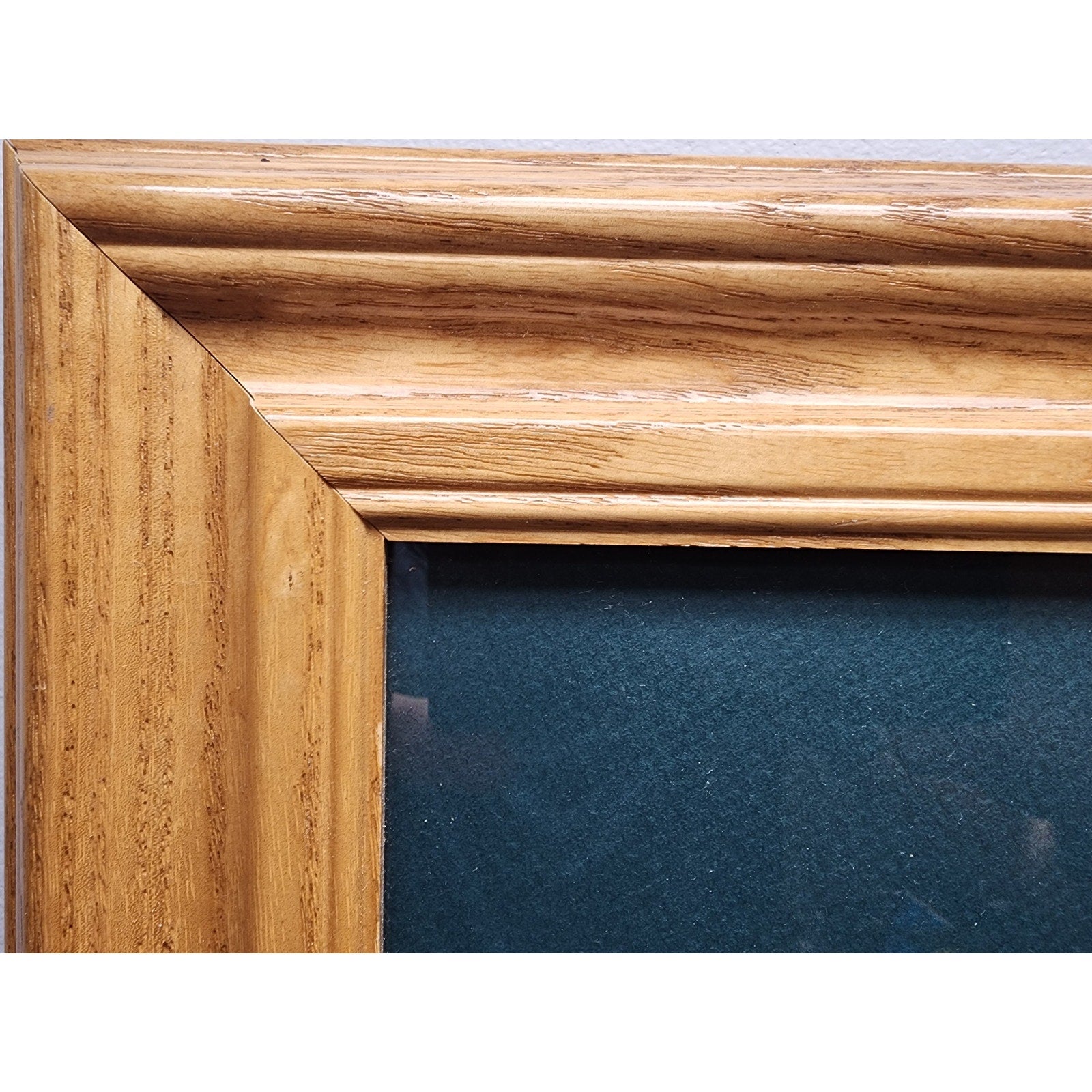 • Frame: Beautiful beveled-edge solid oak wood frame with dark green matting and gold title plaque