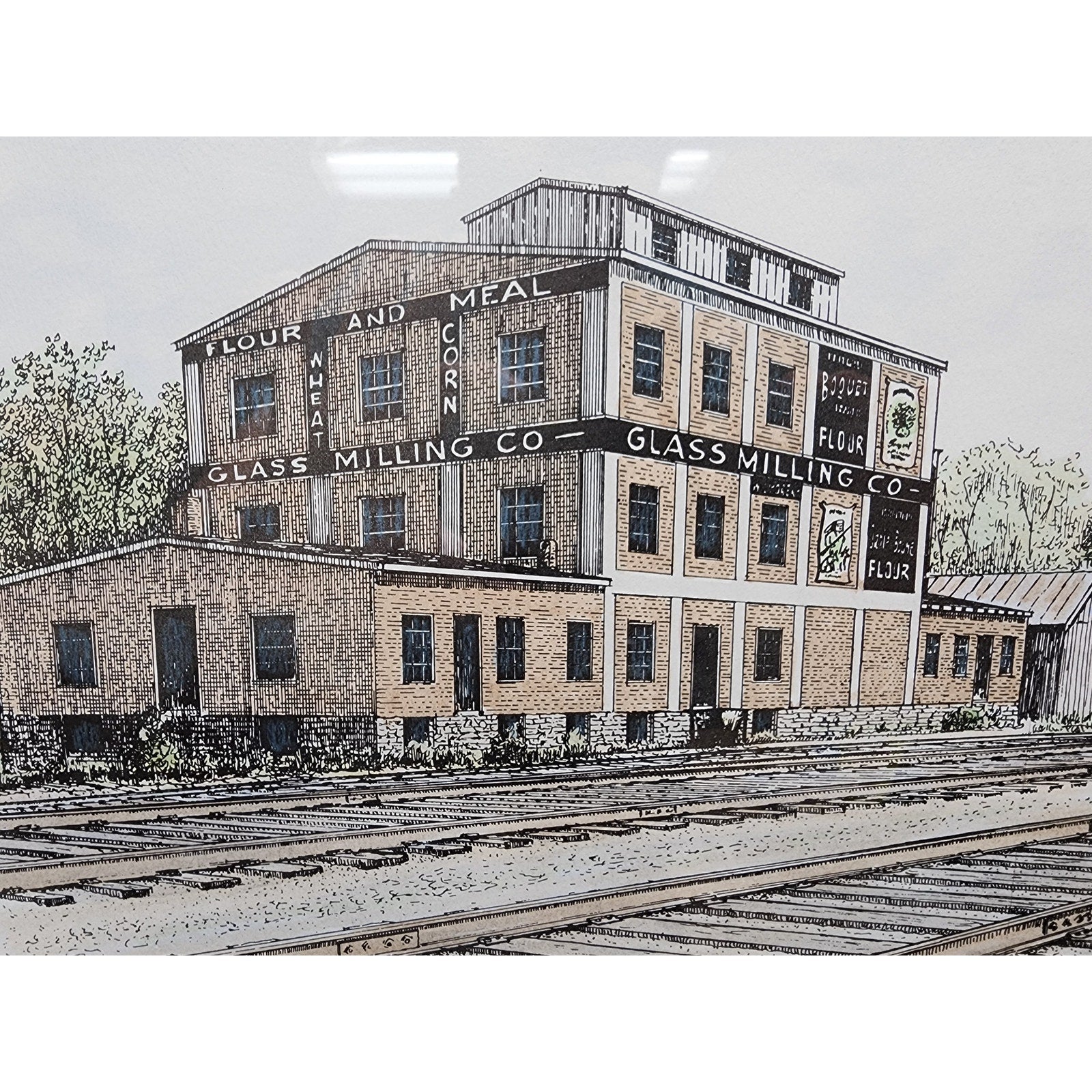 • Subject: Exquisite detailing of the historic Glass Mill Granary building, still standing today, alongside a steam locomotive on the Southern Railroad.
