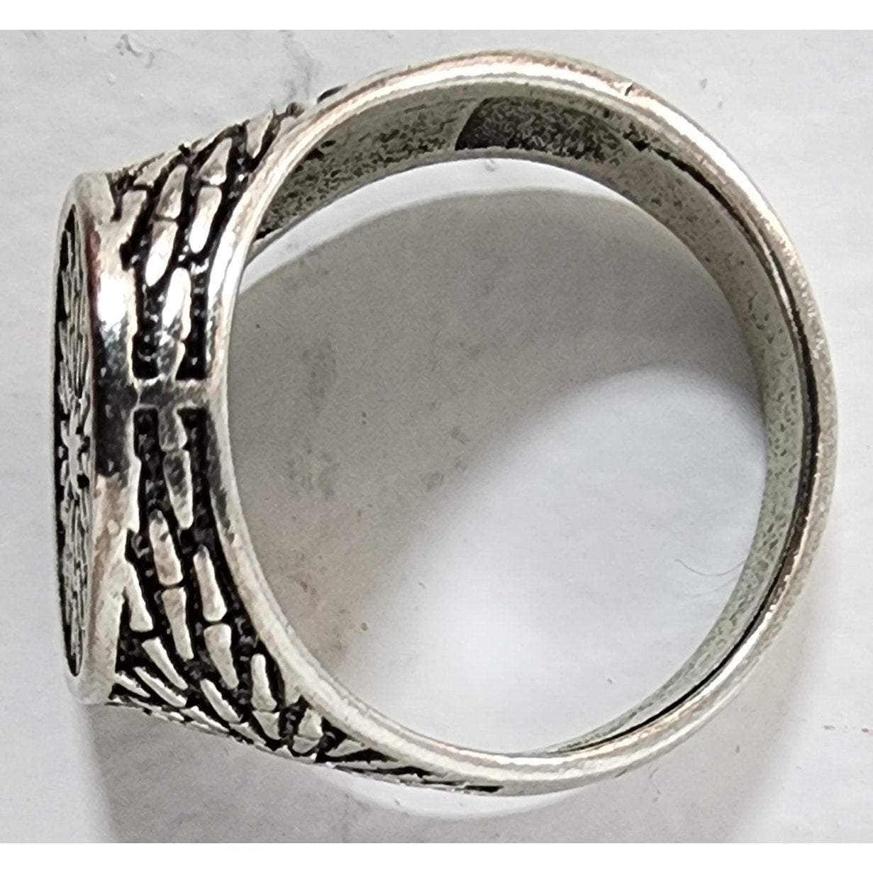 Beautiful stainless‑steel ring in size 9.5 featuring a striking raised sunburst/starburst design on the face.