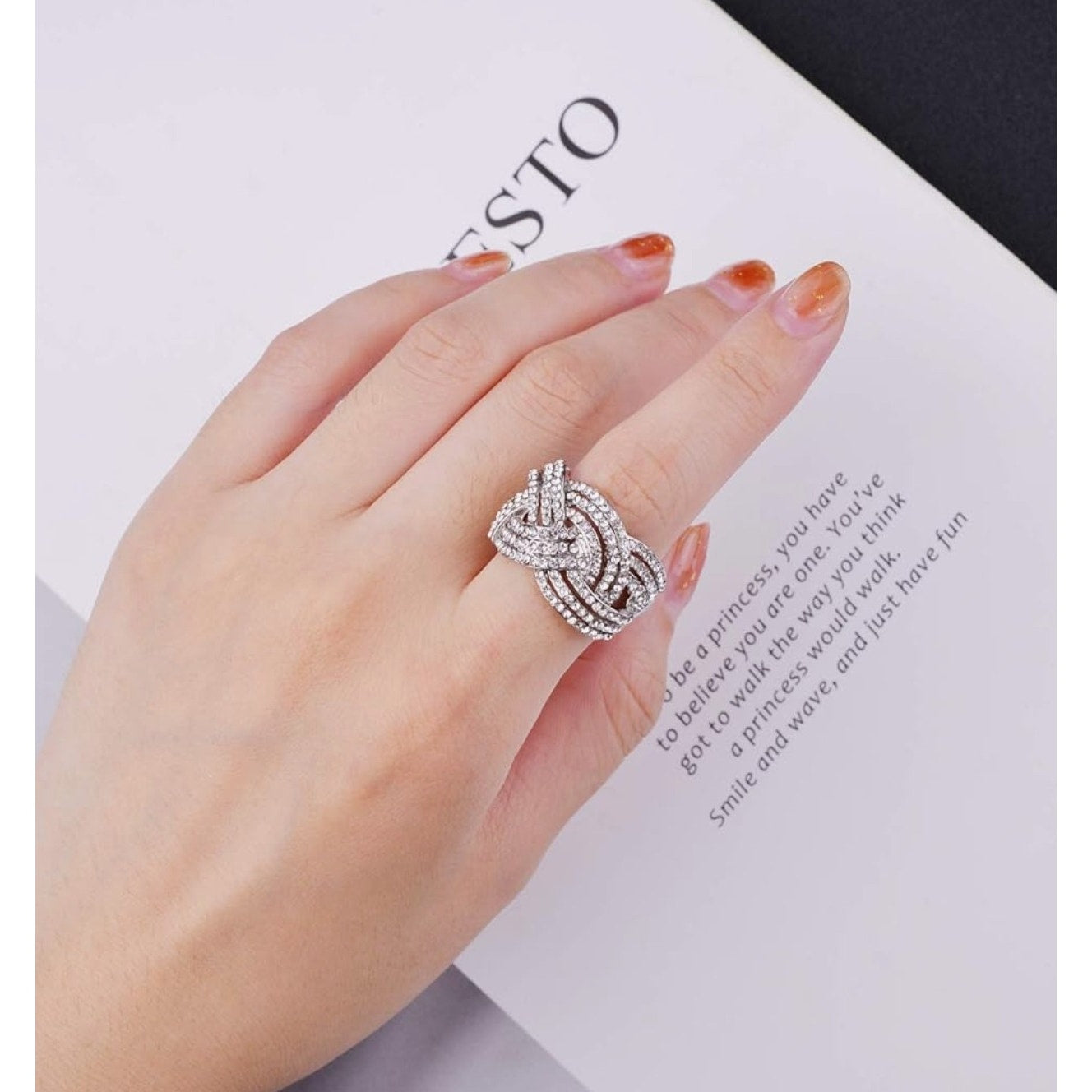 This dazzling Nicole Miller New York fashion ring features a luxurious silvertone finish with rows of sparkling clear crystal rhinestones woven into an elegant twisted design.