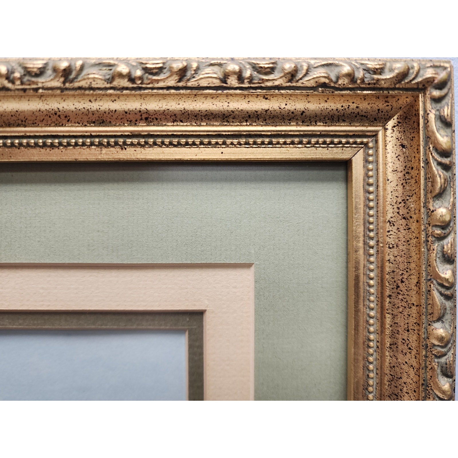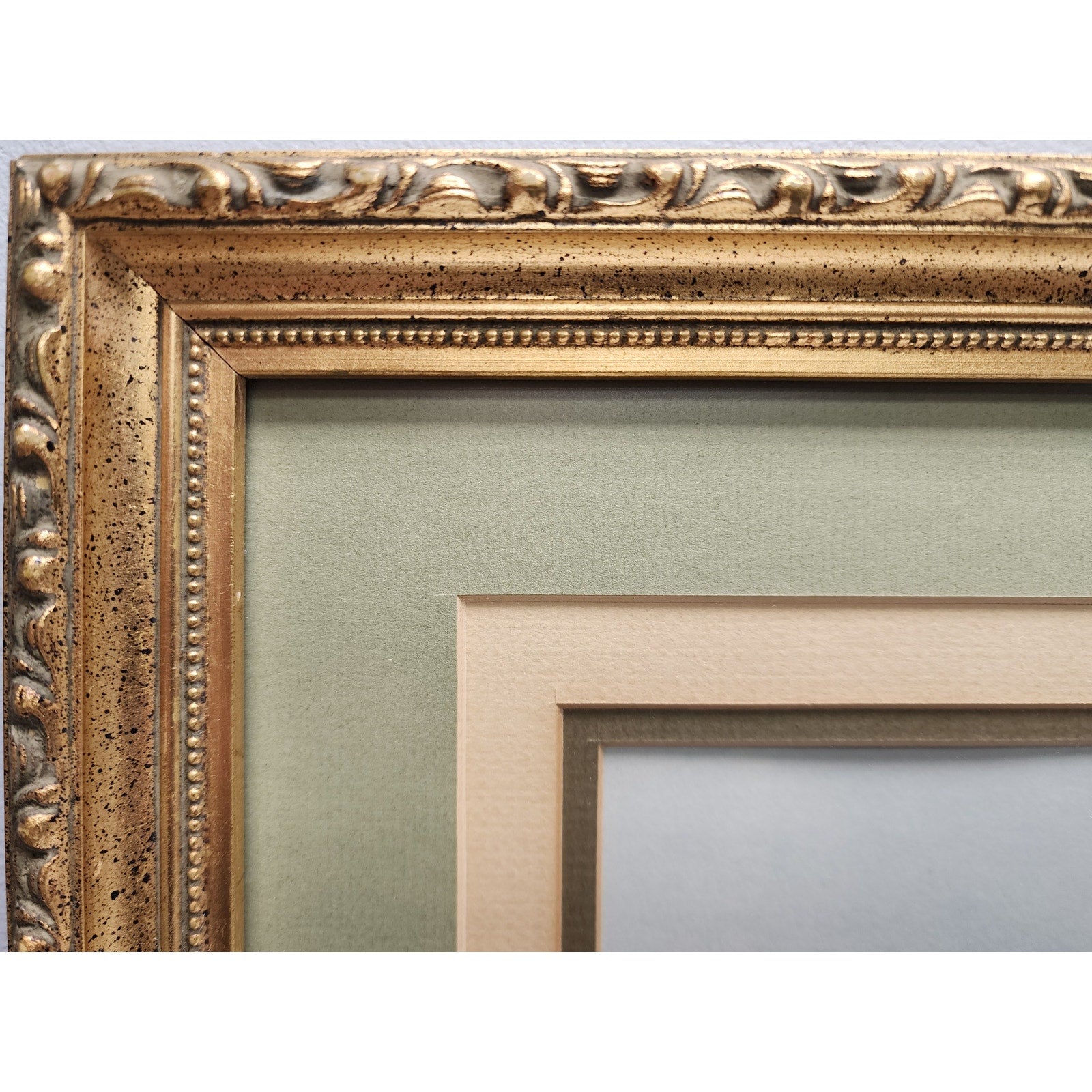 Professionally framed in an ornate gold wood frame with classical scrollwork and bead accents, this piece measures 22" wide by 20" high and 1.06" deep. It features a triple beveled matte: outer ivory (1.375"), middle beige (0.25"), and innermost sage green (0.25").