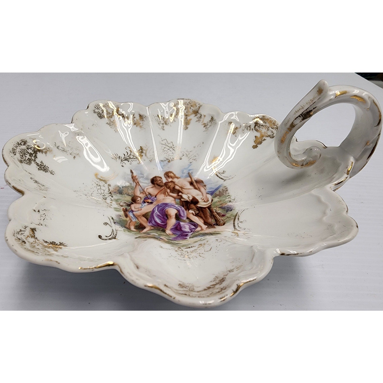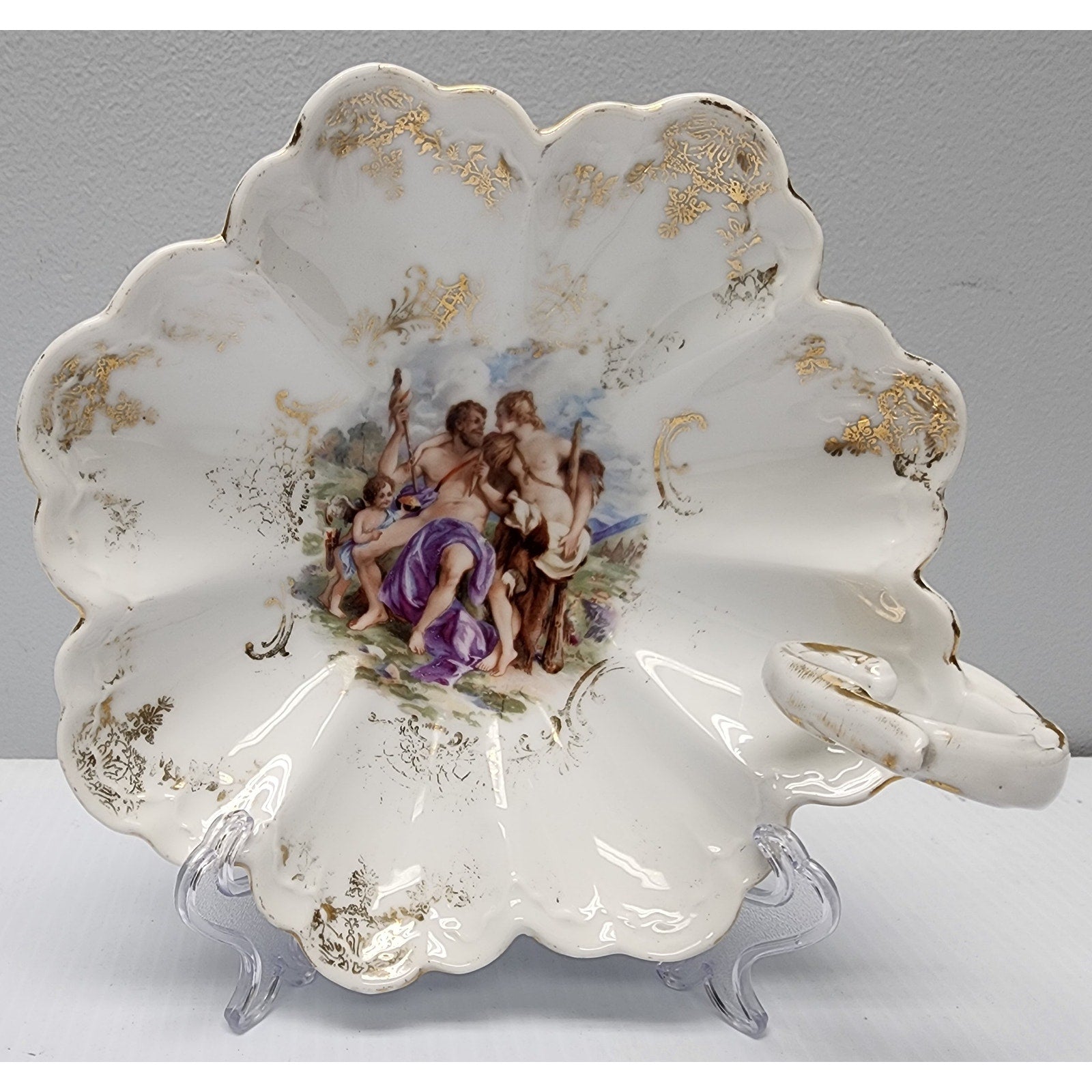 Measuring 7" in diameter (7.5" at widest point), it features a scalloped rim and integrated finger loop handle, richly accented with gold gilt along the rim, loop, and framing of the central tableau.