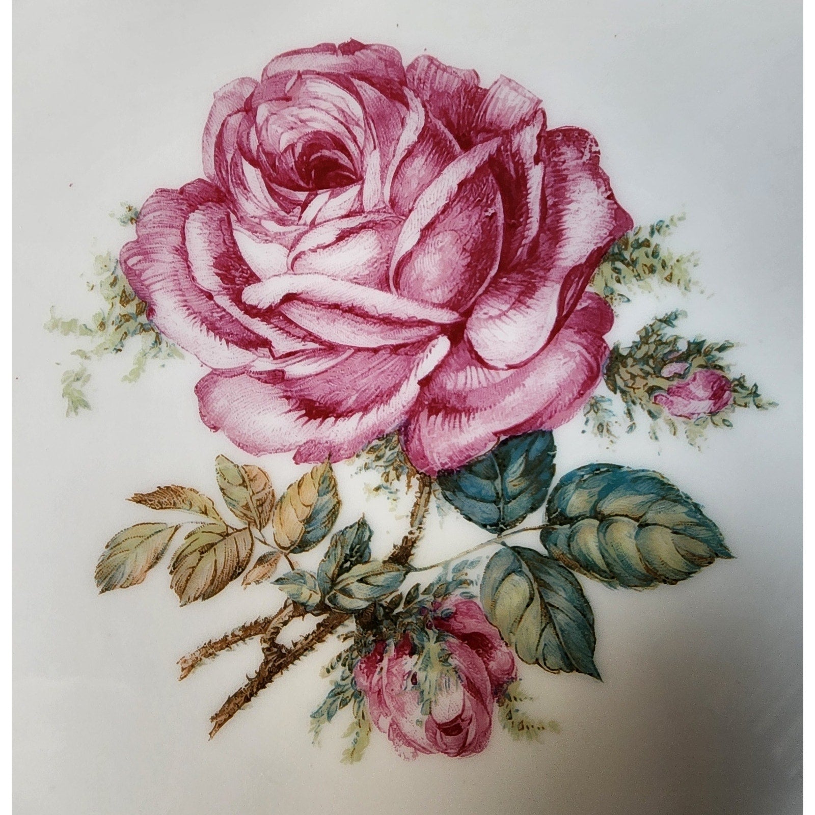 Each plate measures approximately 10.25 inches in diameter and features a central pink rose bouquet surrounded by a delicate genuine gold-trimmed scalloped border.