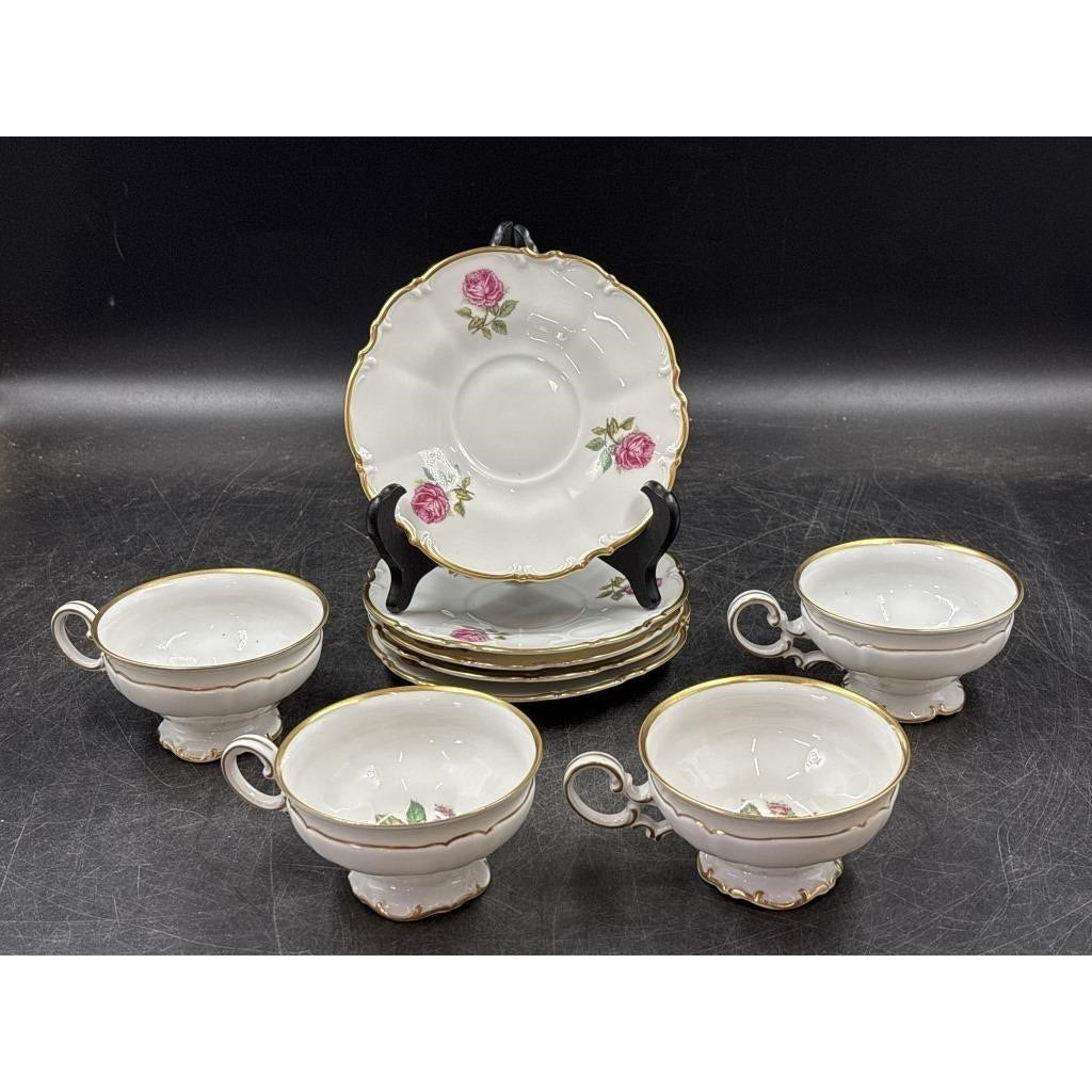 This charming set includes four tea cups and five matching saucers from the Hutschenreuther Selb Pasco “The Dundee” collection, crafted in Bavaria, Germany.