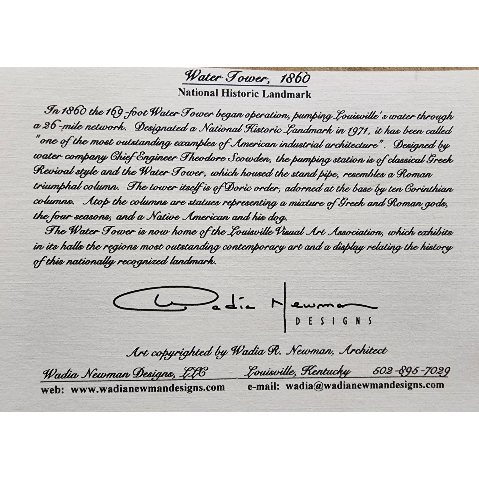 Celebrate one of Louisville’s most iconic landmarks with this signed lithograph by architect and artist Wadia (Nadia) Newman, titled “The Water Tower.”
