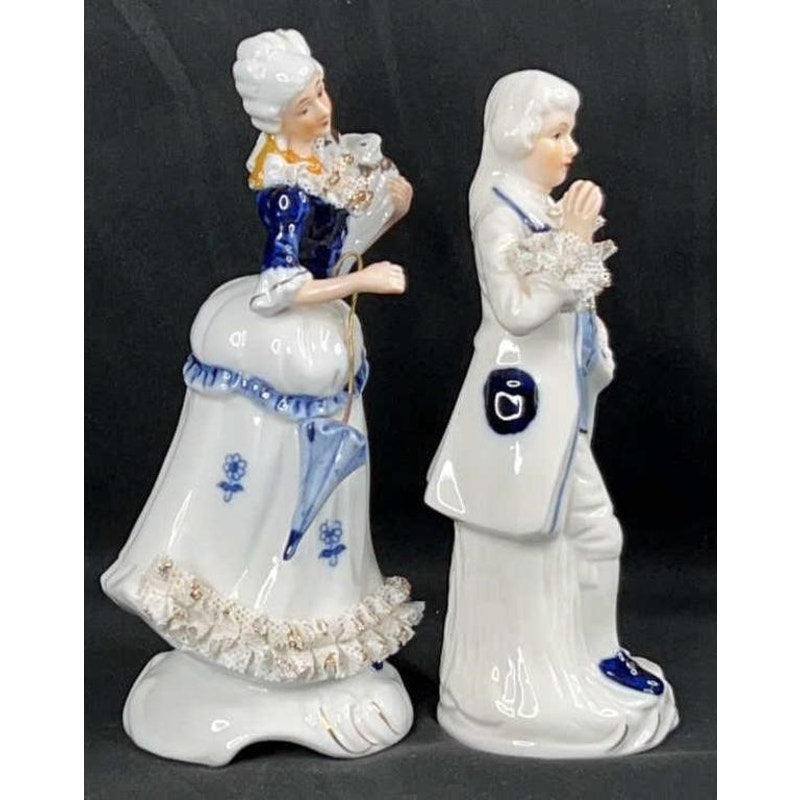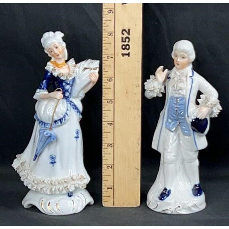 Victorian Style Blue White Porcelain Figurine Pair w/ Gold Accents Hand Painted