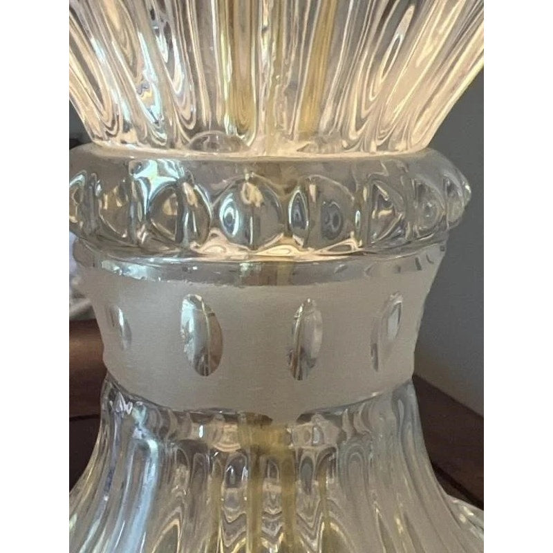 The lamp’s base showcases intricate vertical ridges and frosted oval cutouts, reflecting light with stunning clarity and elegance.