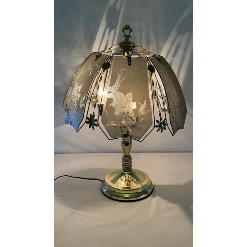Elegant vintage brass touch technology table lamp with a stunning etched glass floral shade.