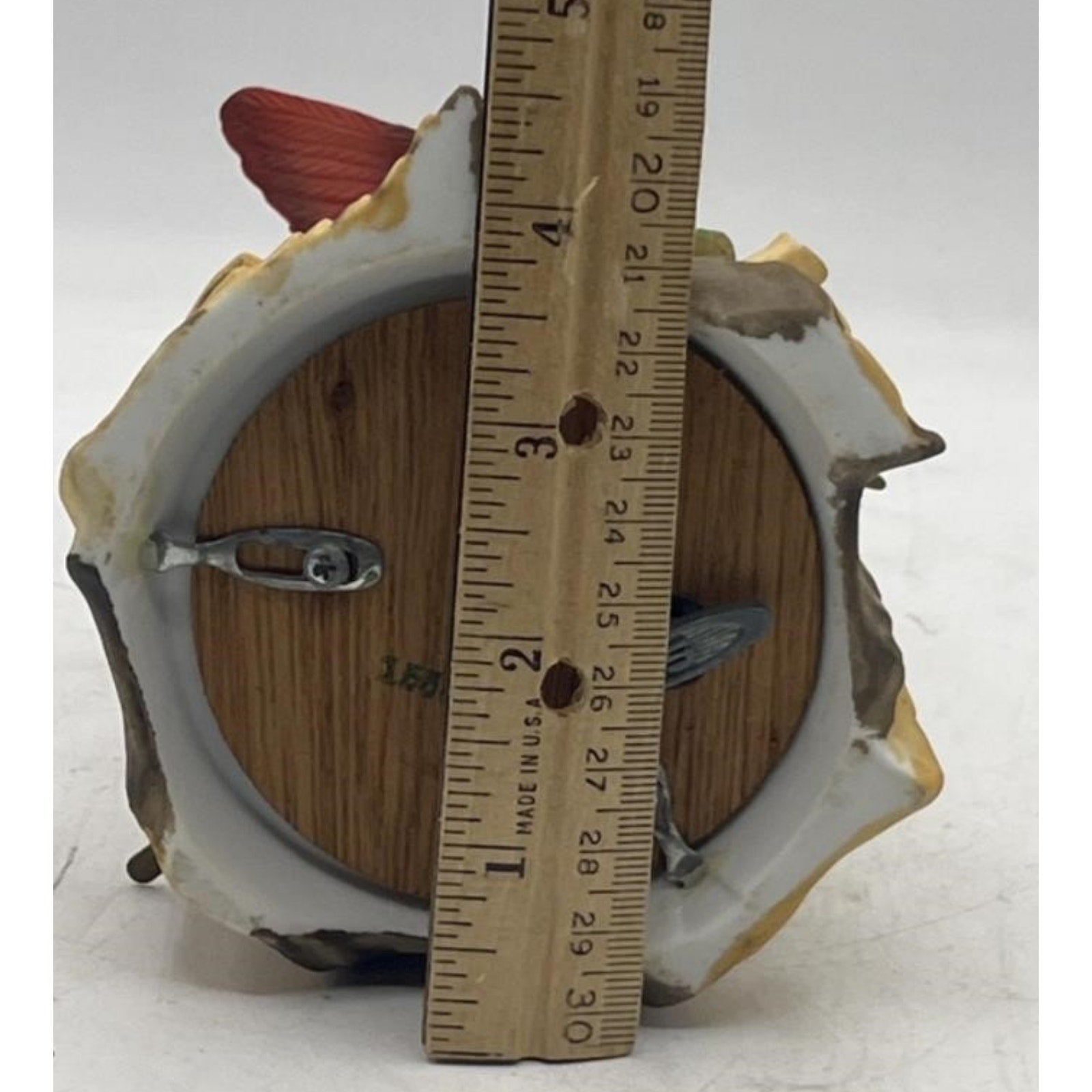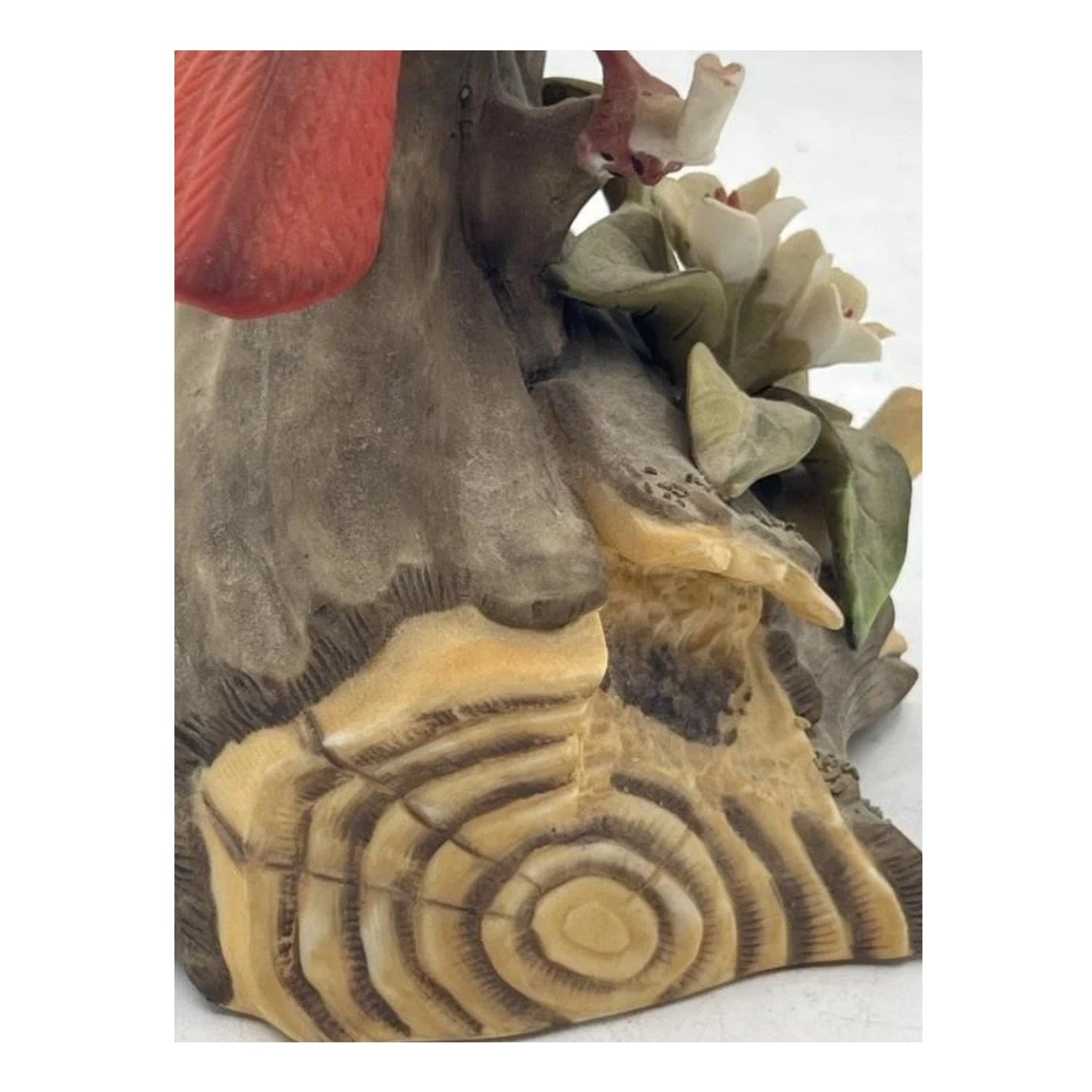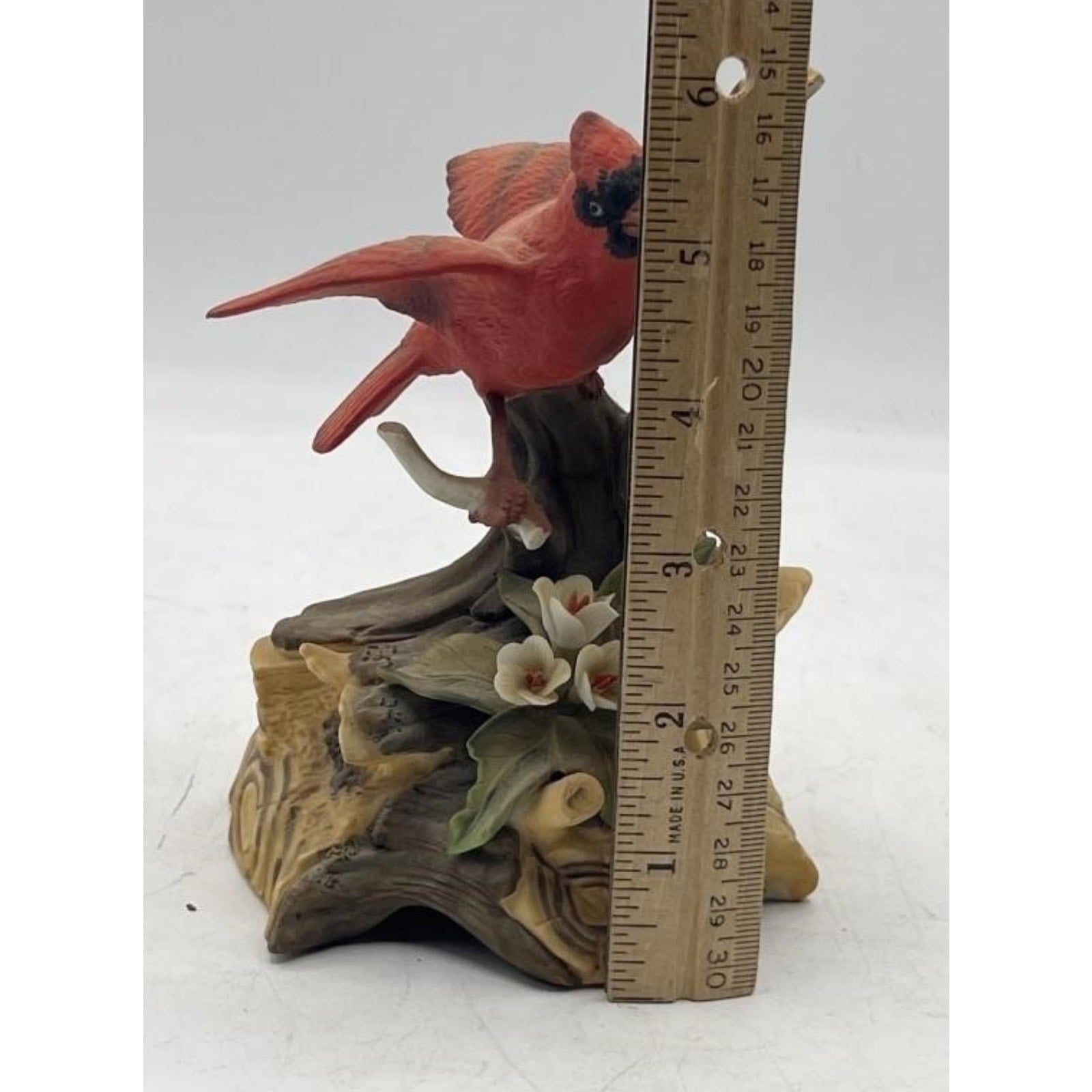 Add a touch of nature’s elegance to your collection with this beautiful vintage cardinal music figurine. Standing approximately 6 inches tall, this finely crafted piece features a vivid red cardinal perched gracefully atop a detailed tree stump, adorned with delicate white flowers and lush green foliage.