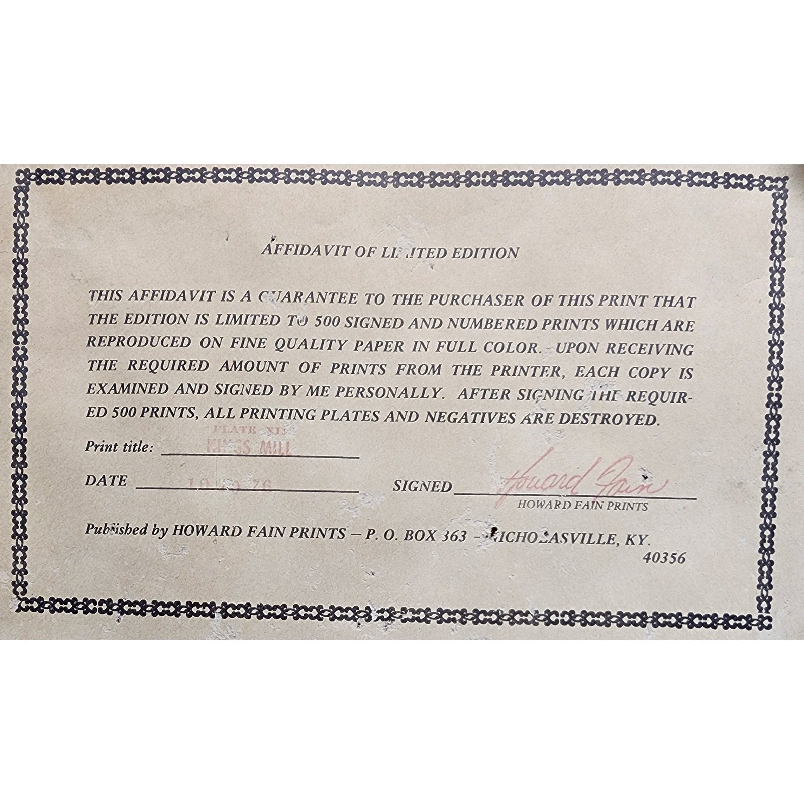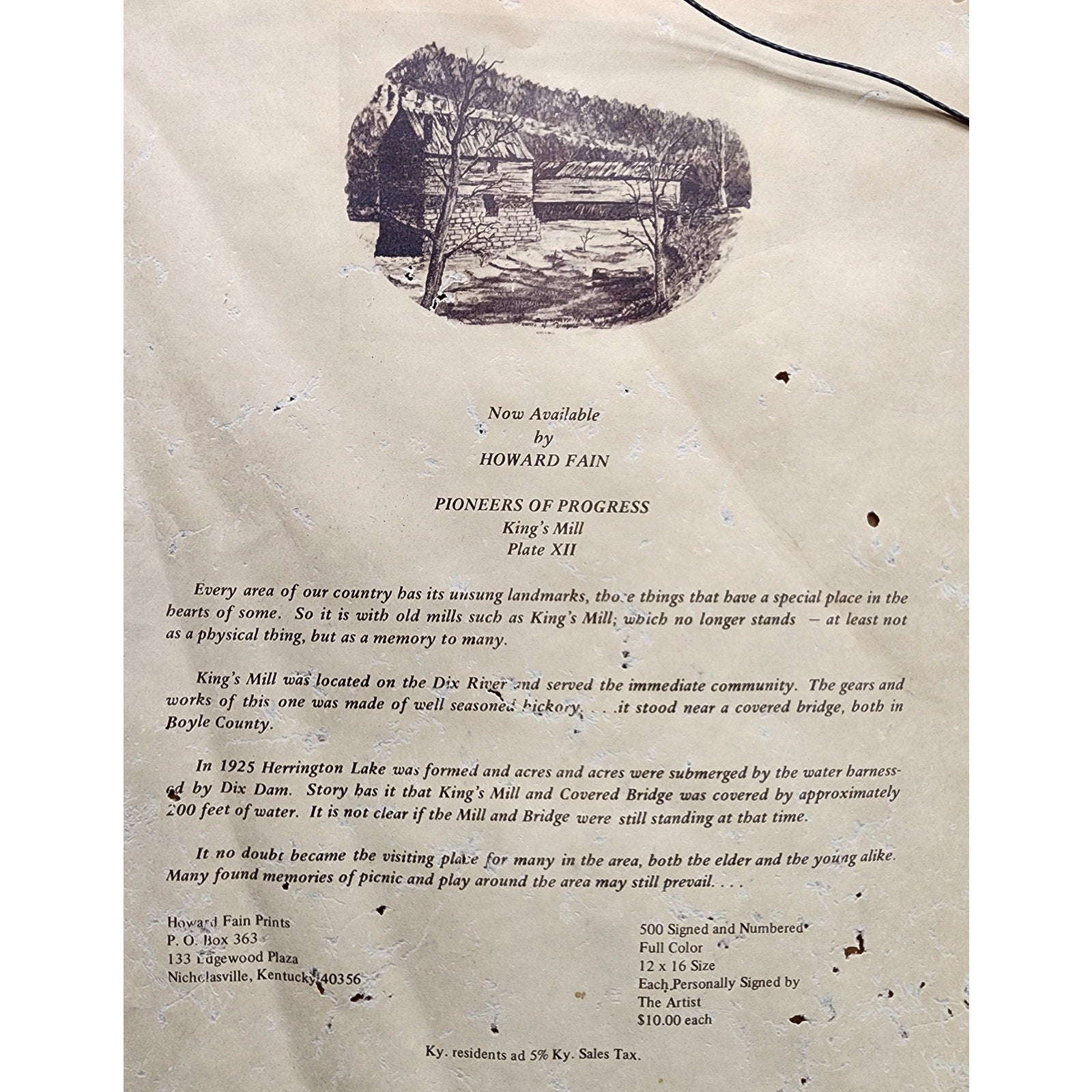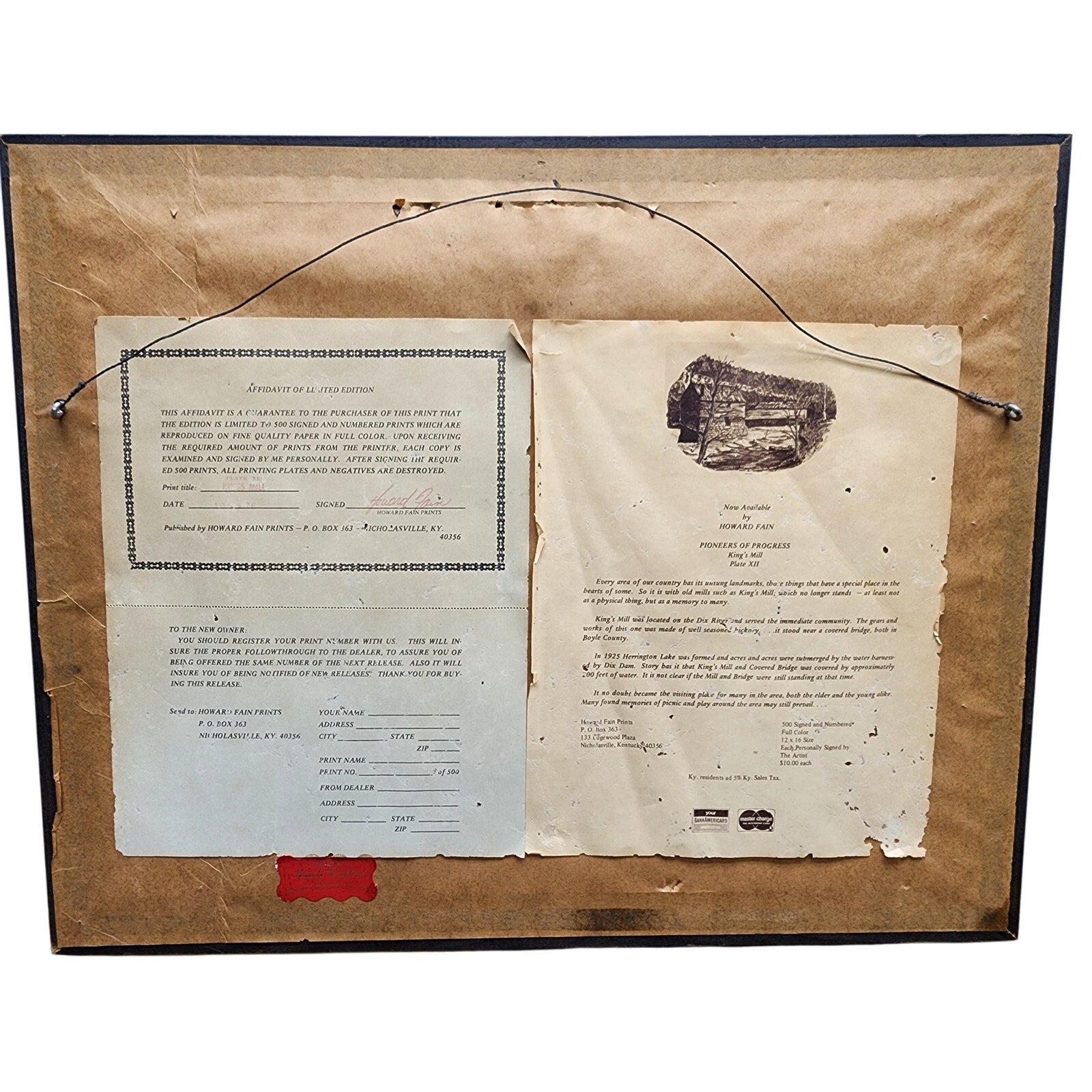 Up for your collection is a rare 1976 limited-edition print by Howard Fain, titled “King’s Mill.” This piece is hand-signed on both the front and back, fully authenticated, and proudly numbered 291 of only 500 produced—an exceptional find for any serious collector. This print from his Pioneers of Progress series.