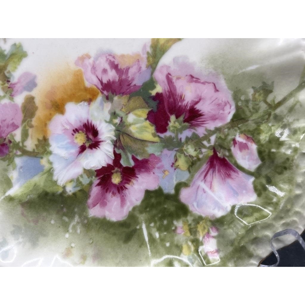Featuring hand-painted floral sprays in vivid pinks and purples with delicate green leaves, the scalloped edge is trimmed in genuine 22k gold.