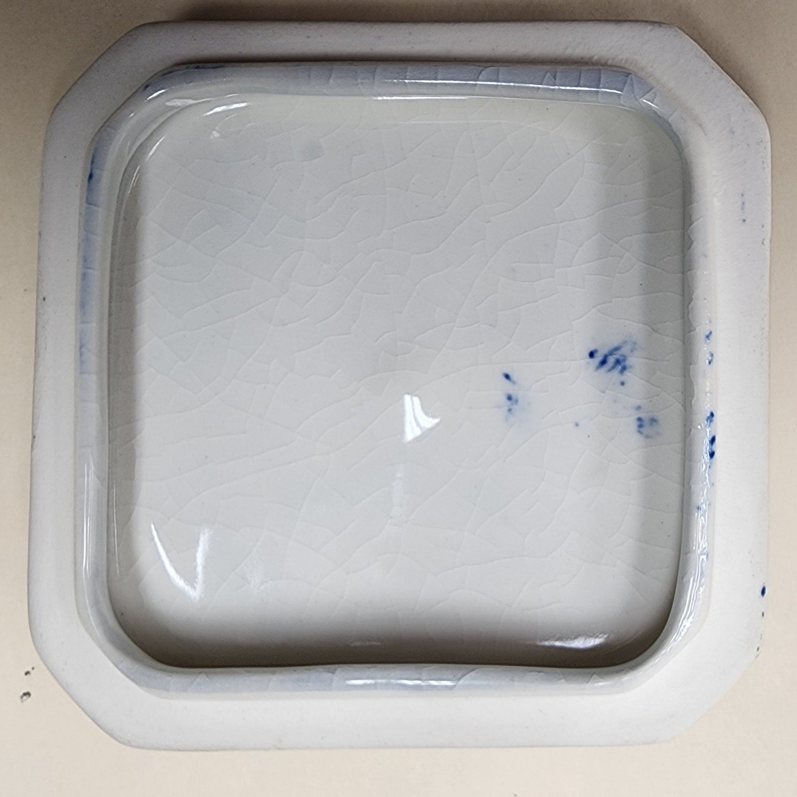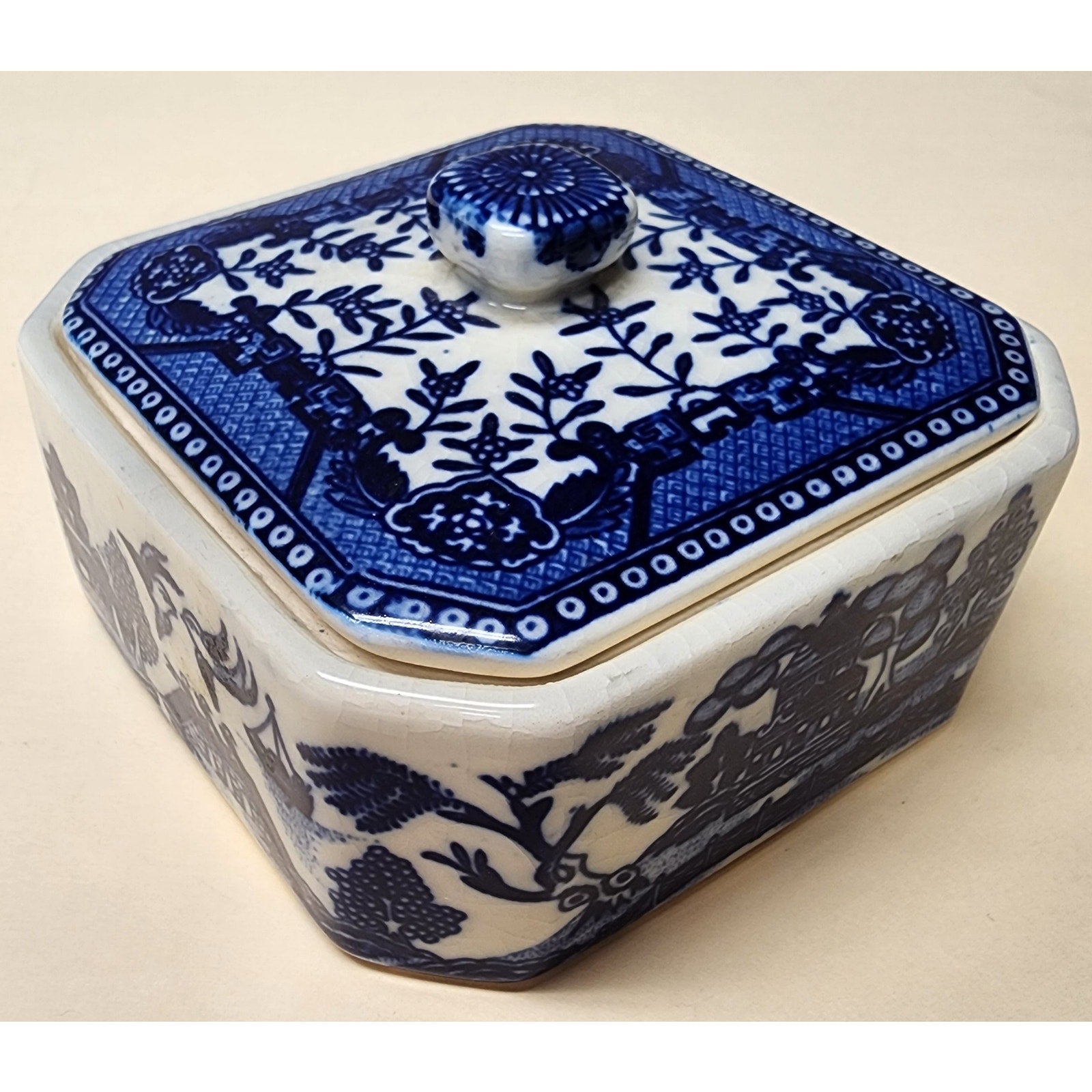 This compact covered dish is perfect for collectors of Blue Willow, Japanese porcelain, or Moriyama ware, and makes a striking accent piece for display or functional use.
