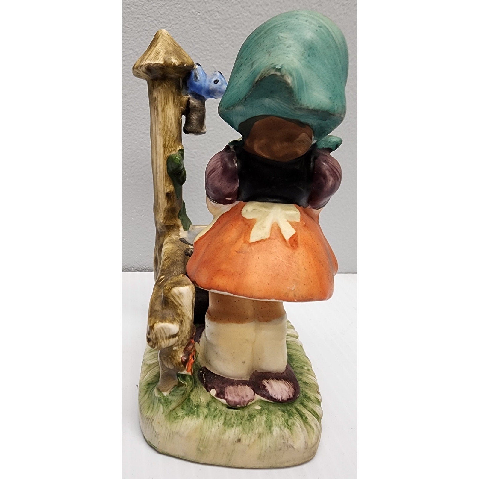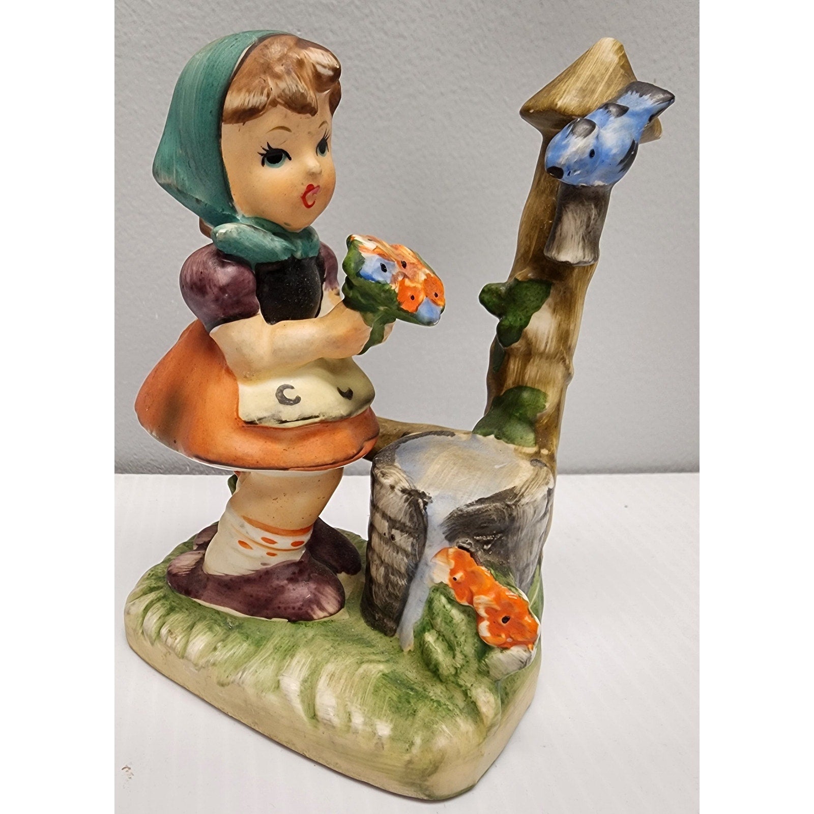 • The girl figurine features a green headscarf, purple blouse, and orange skirt, holding a bouquet of flowers beside a tree stump with perched birds ans water overflowing a bucket.