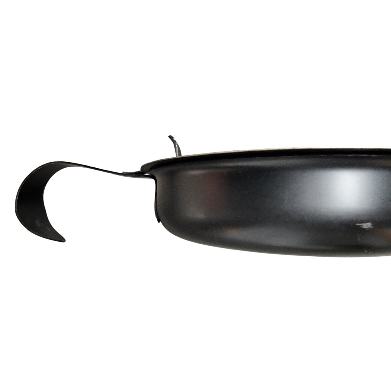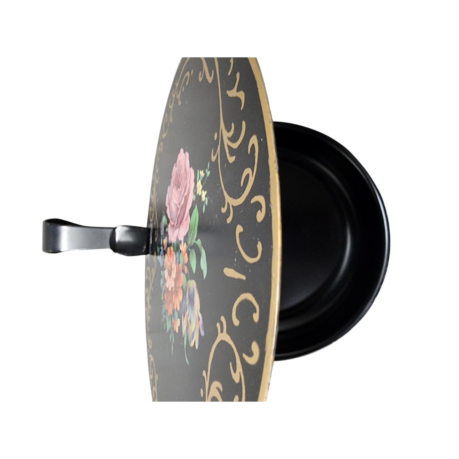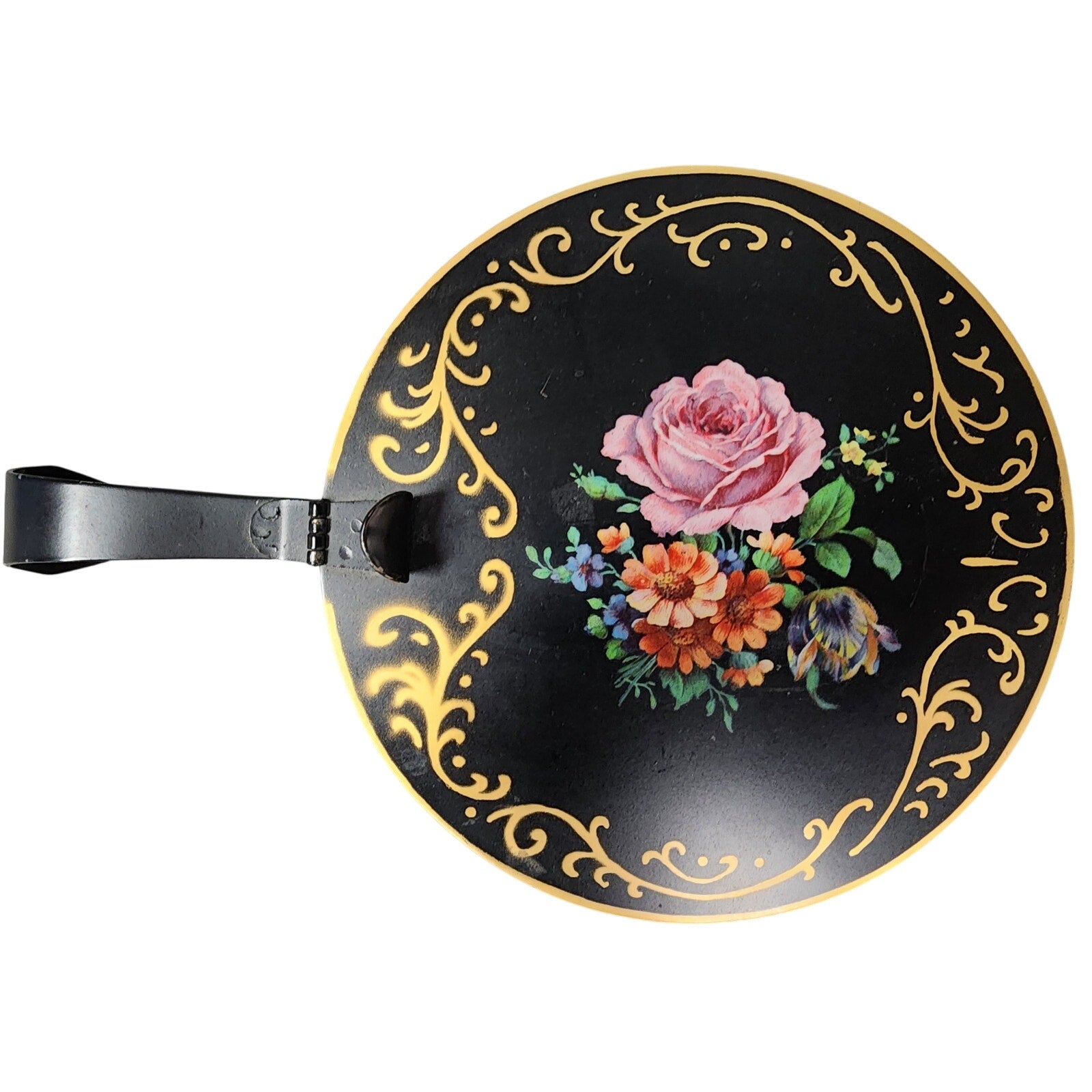 • Hand-Painted Silent Butler / Crumb Catcher – Classic toleware design with black ground and a vivid rose bouquet, framed in ornate gilt scrollwork. A functional yet decorative piece, perfect for display or use. Crumb catcher is 7" diameter and widest point with handle is 9.5". Catcher is 1.5" deep. All metal.