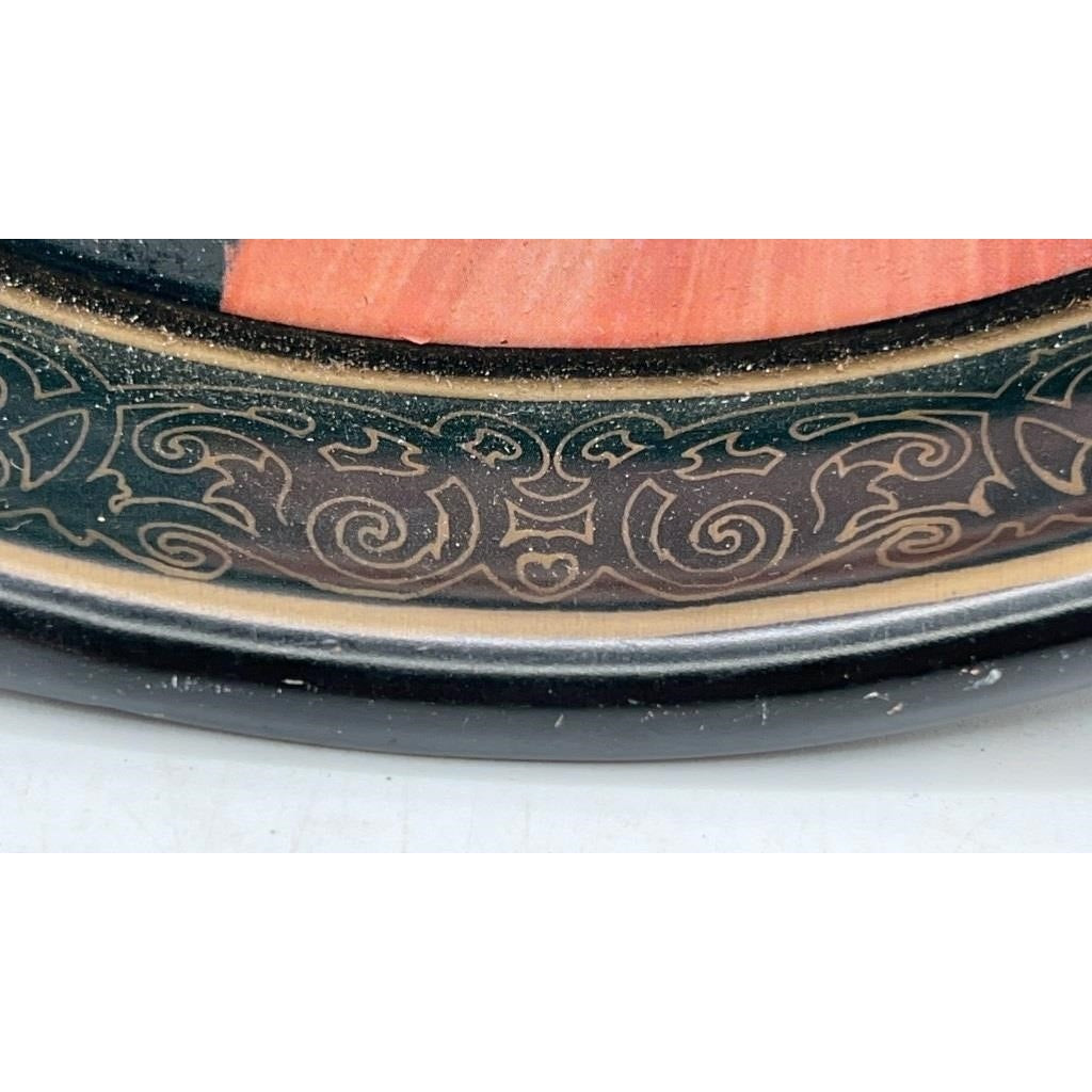 This oval-shaped tray measures approximately 12.5 inches x 15 inches and is 1 inch deep, with elegant period artwork and classic branding: