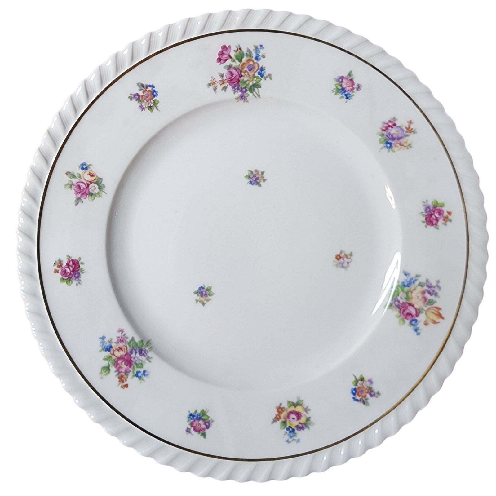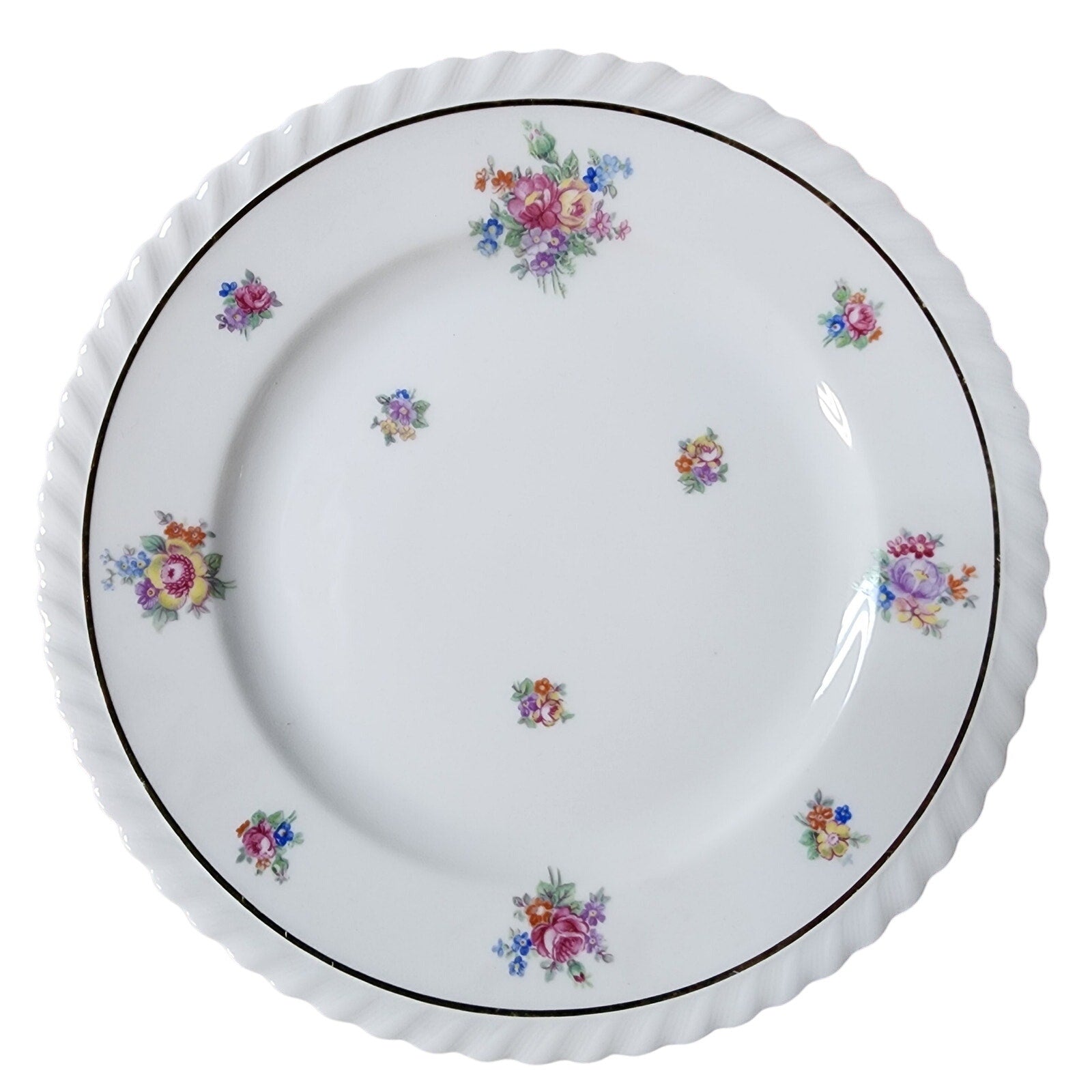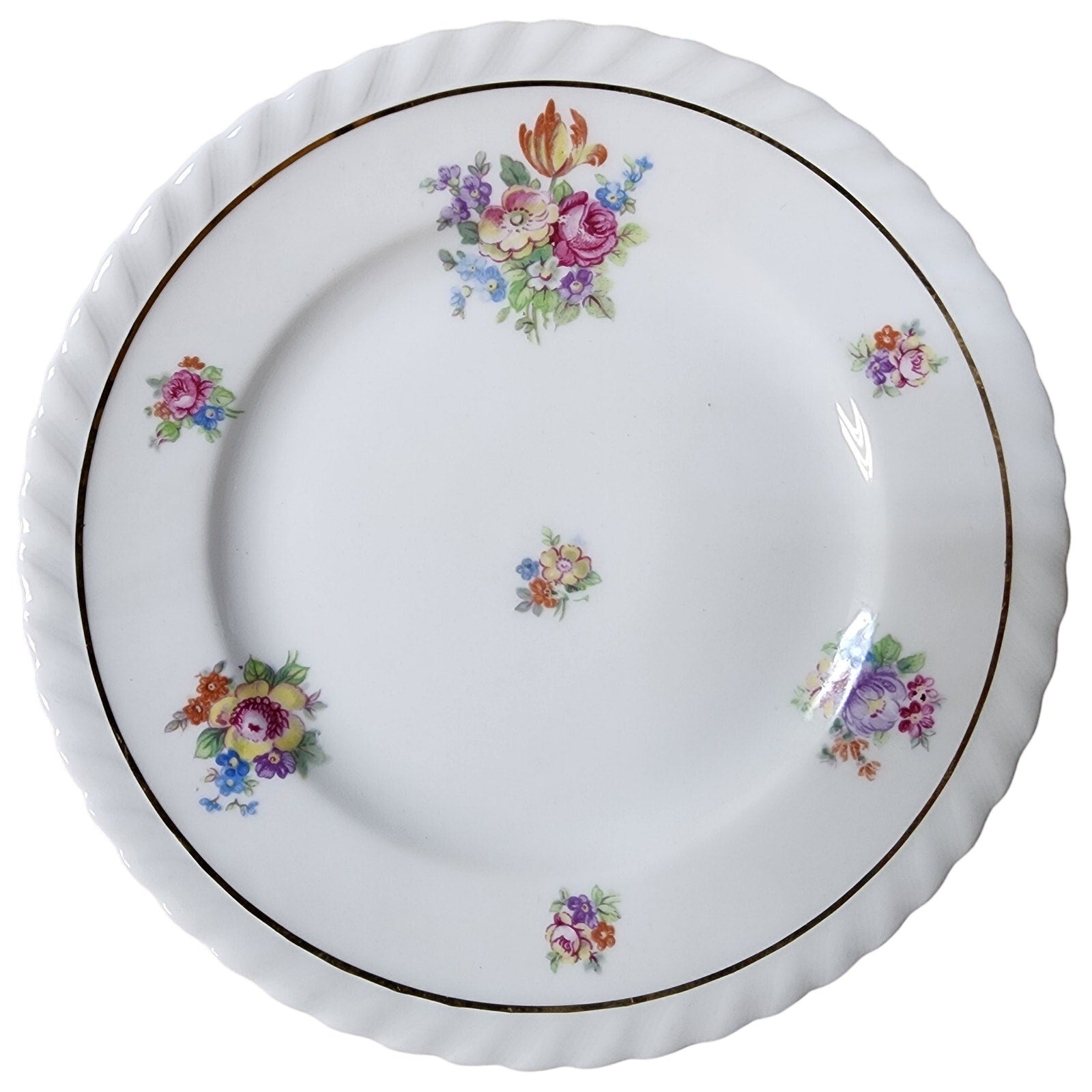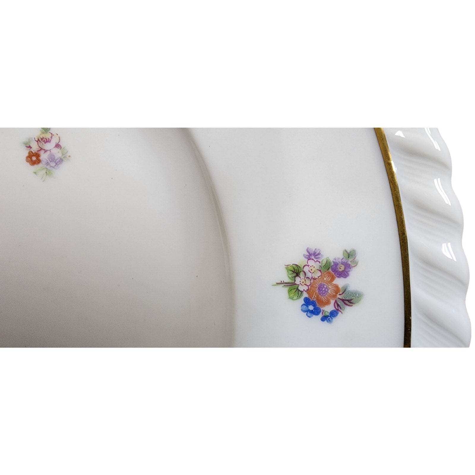 • Fine white porcelain with hand-painted floral sprays featuring pink roses, orange tulip-like blooms, golden-yellow blossoms, delicate blue forget-me-nots, and violet accents.