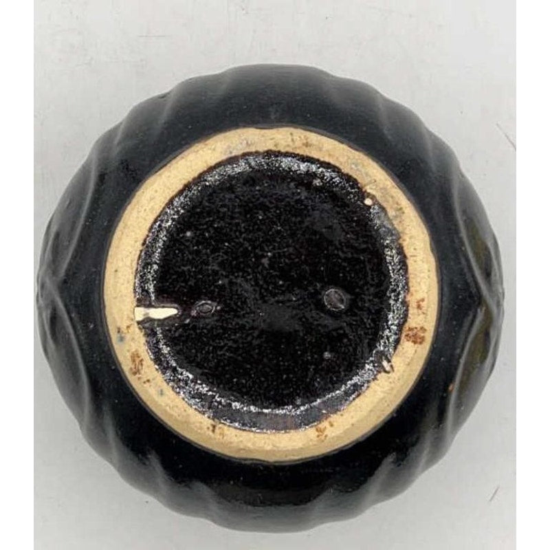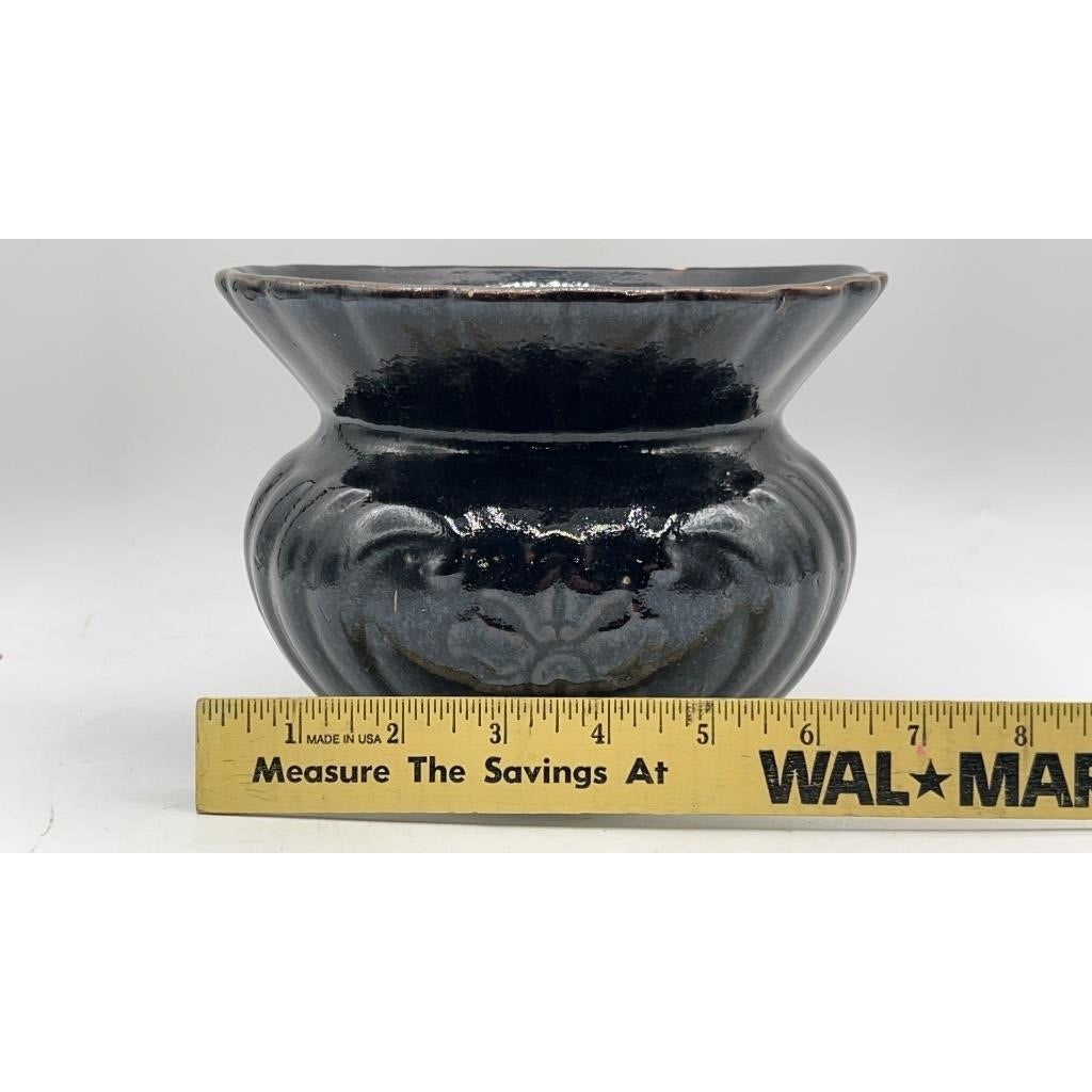 VTG Glazed Stoneware Spittoon Floral Pattern 7" Dark Glaze w/ Repair