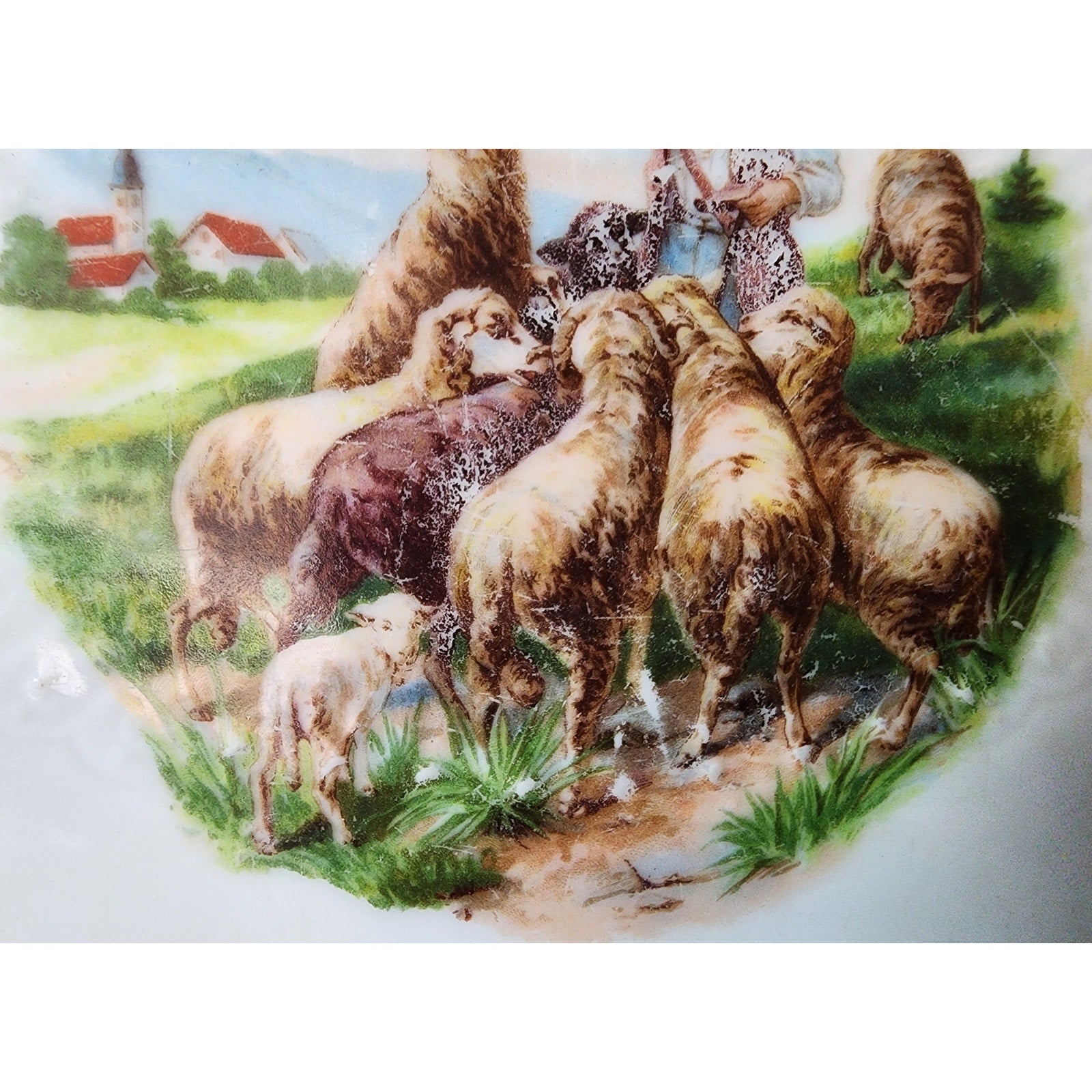 • Design: Pastoral countryside scene with shepherd boy and sheep, floral rose border, scalloped rim with embossed details