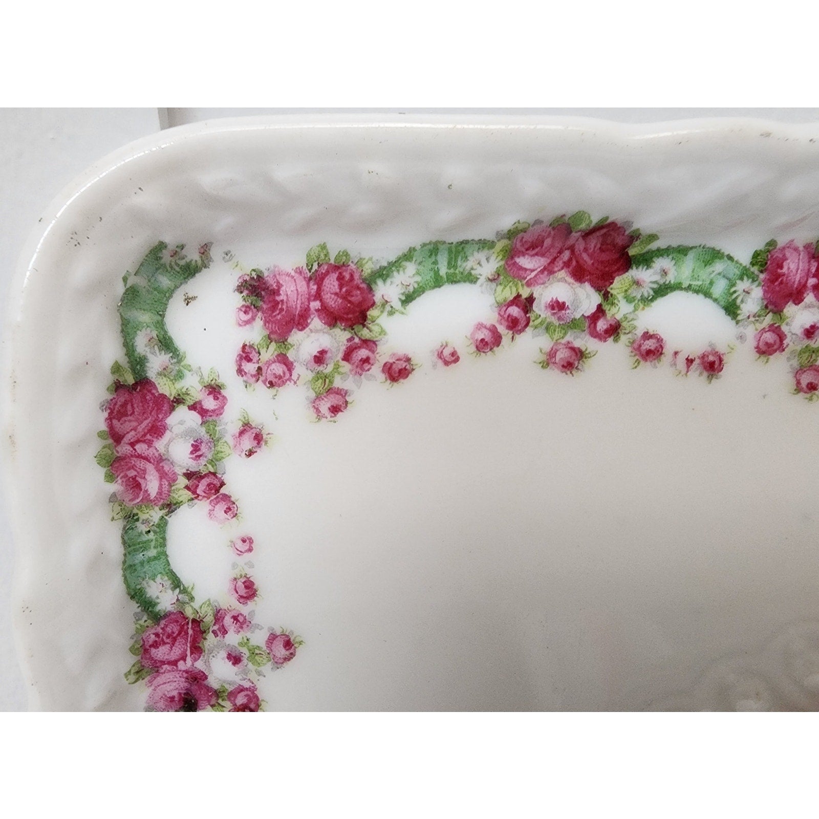 A charming vintage porcelain rectangular tray featuring a pastoral hand-painted scene of a shepherd boy with his flock of sheep, framed by delicate pink roses and green leaves along the inner rim.