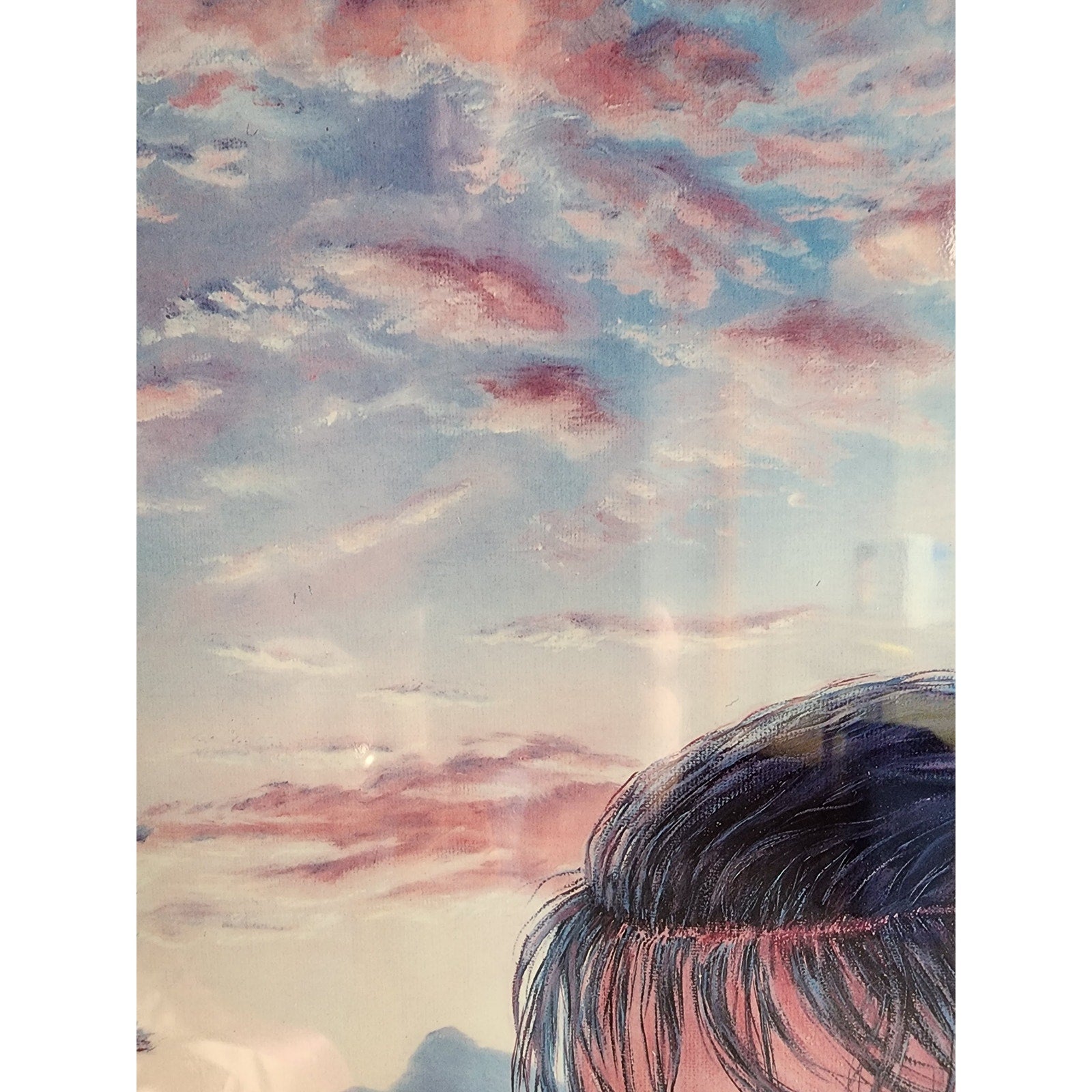 This vintage signed serigraph by artist Jonnie’ Ko Kostoff (1990) depicts a serene Native American girl holding a wolf pup, framed against a dramatic mountainous landscape and trees.